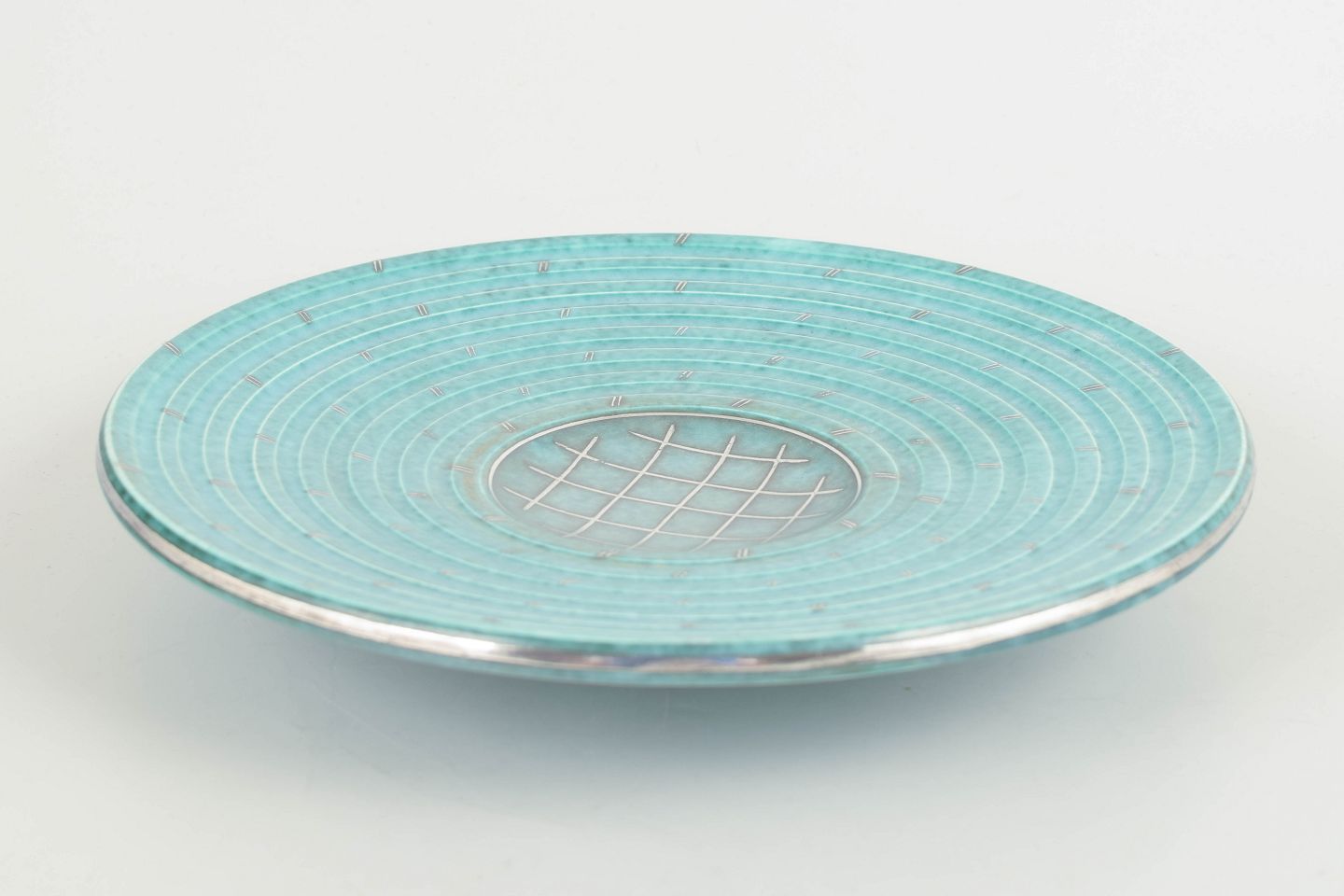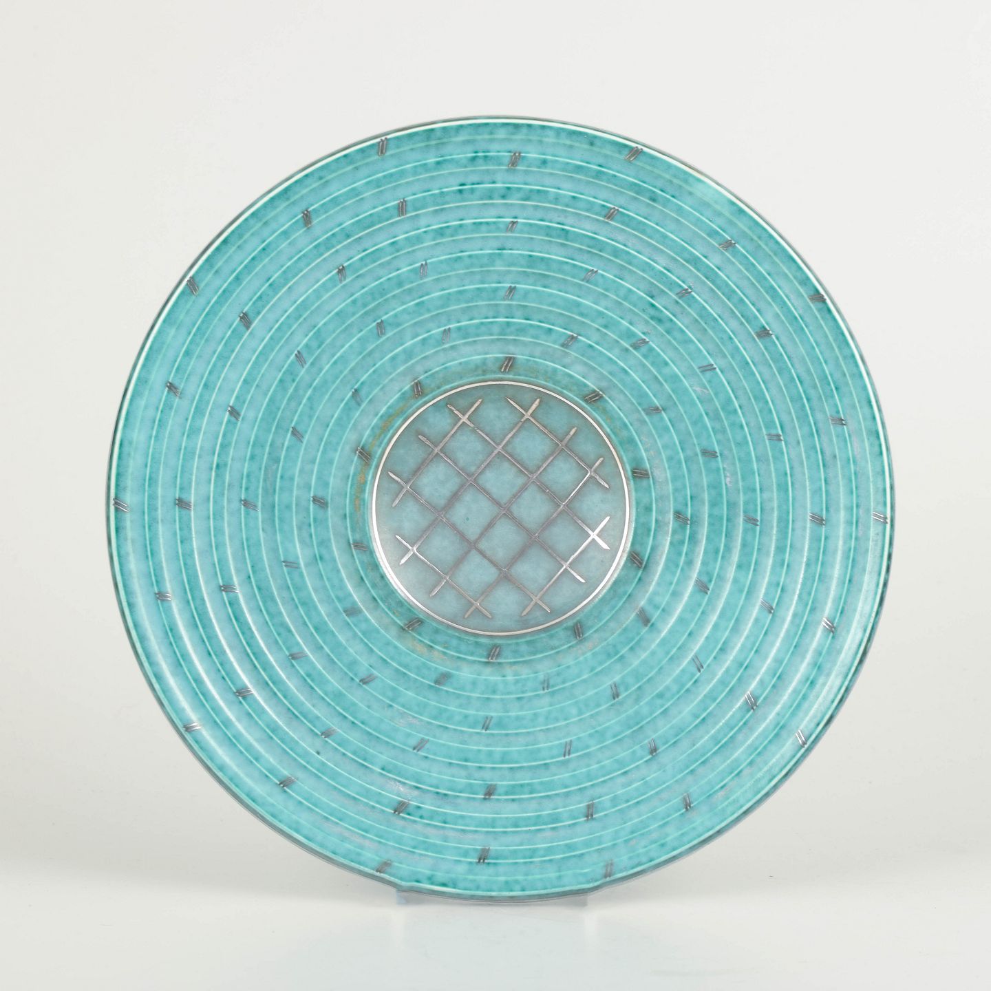 Rundt fajancefad med turkisgrøn glasur og indlagte sølvdekorationer i geometrisk mønster, typisk for Kåges berømte Argenta-serie.
