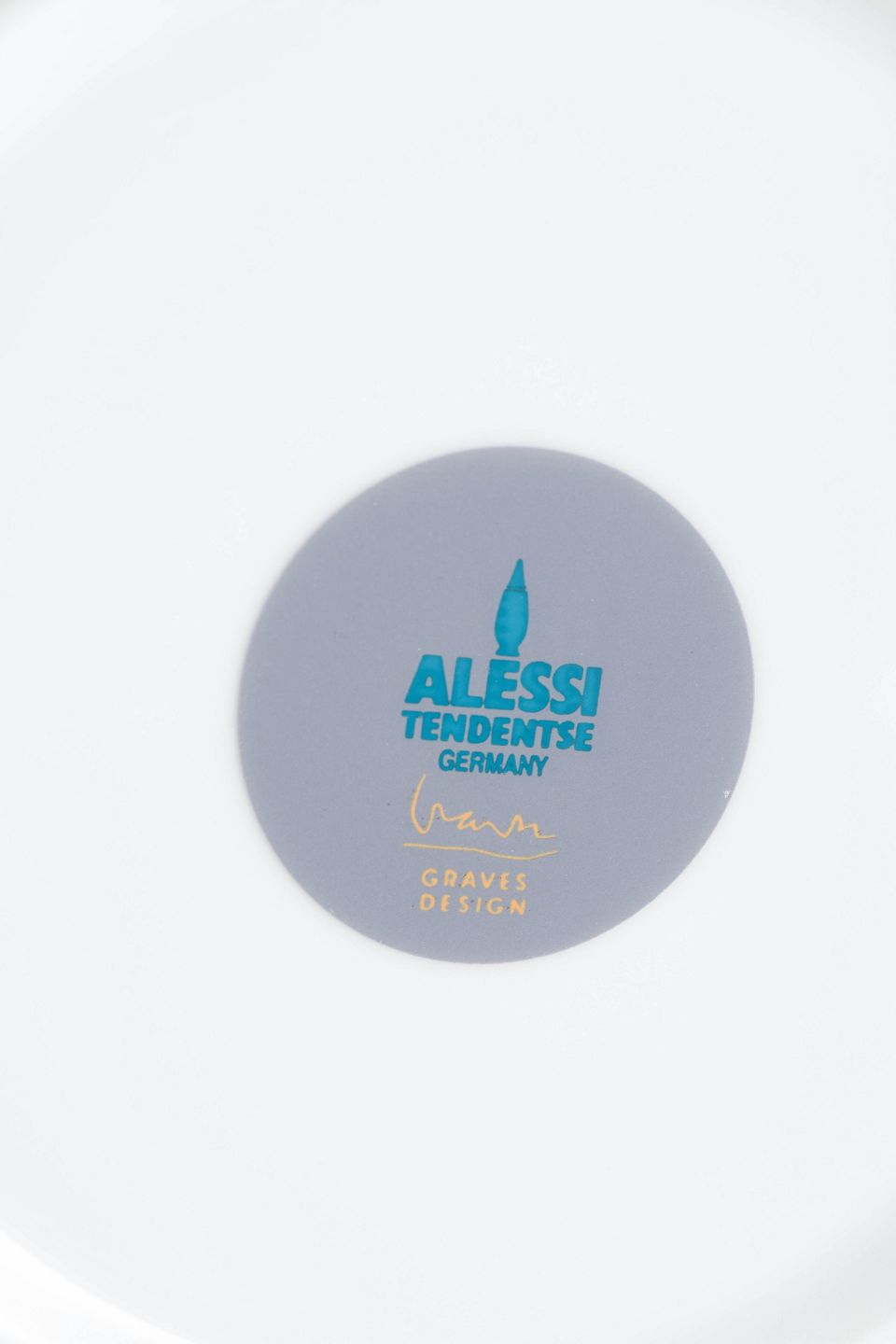 Porcelænstallerkener med karakteristisk bred gul kant med blå konturer i blomstermotiv, et eksempel på Graves’ postmoderne formsprog for Alessi i perioden.