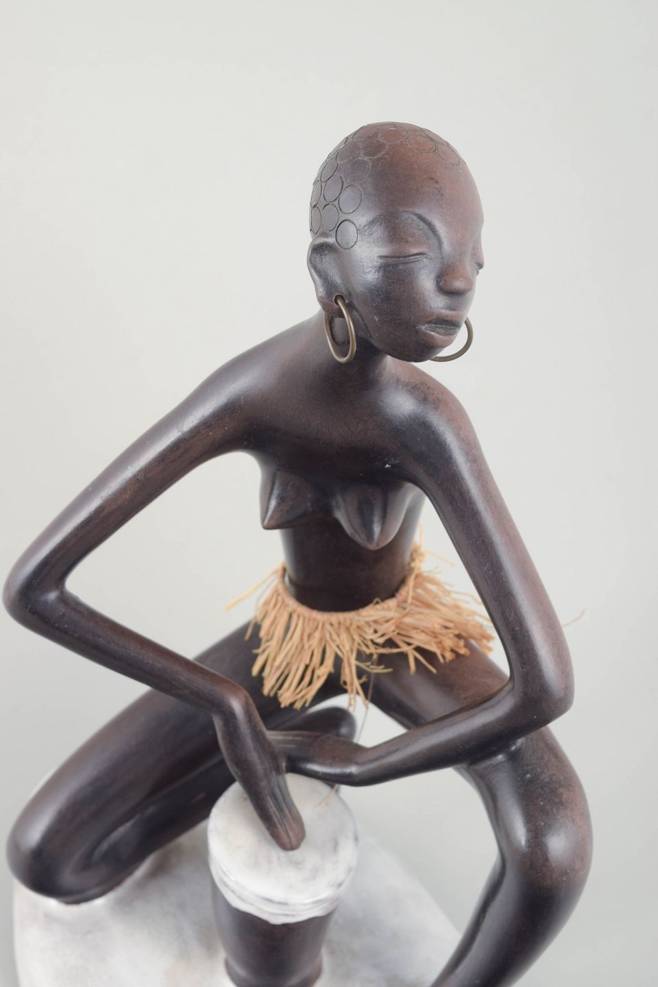 Stor keramisk figur af en kvinde, knælende med tromme, udført i brun glasur med hvidt underlag og stråskørt. Typisk for Anzengrubers eksotiserende figurer fra perioden.