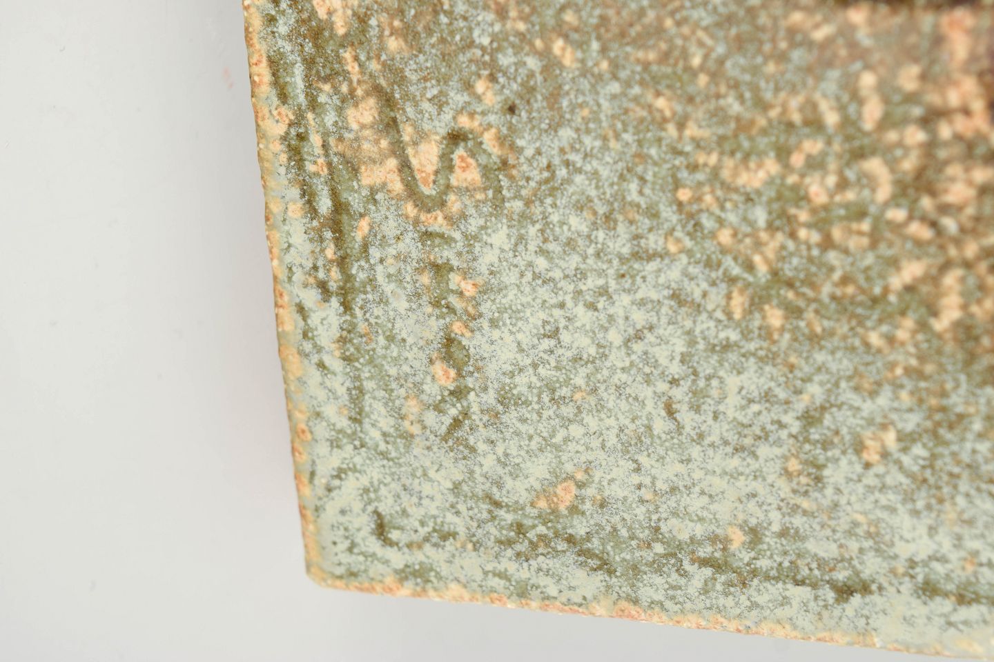 Keramisk vægrelief i reliefteknik med motiv af en stiliseret påfugl i grønne og blå glasurtoner.
