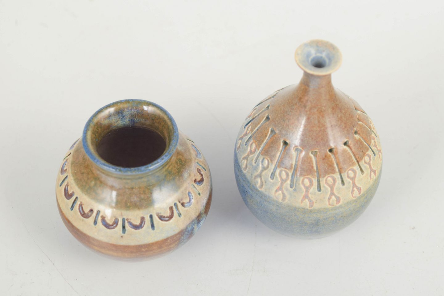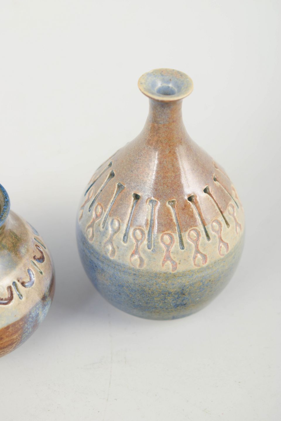 To miniaturevaser i stentøj med blå, grøn og brun glasur samt indgraveret dekorbort omkring skulderen. Klassiske eksempler på 1970’ernes svenske kunsthåndværk med naturinspirerede farver og håndlavet karakter.