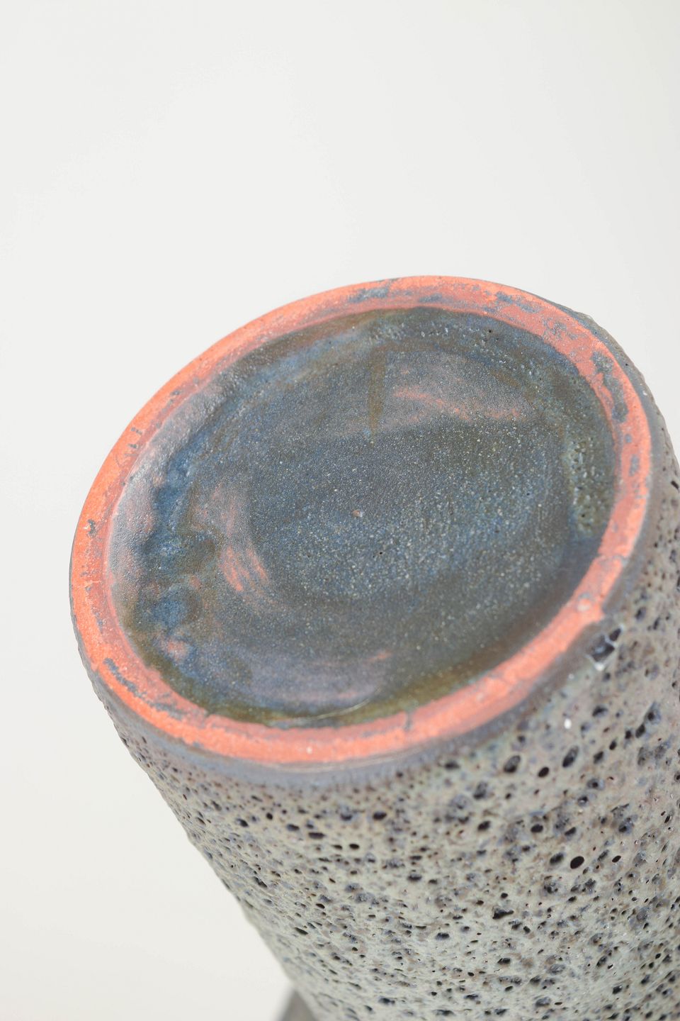 Håndlavet stentøjsvase med karakteristisk lava-glasur overflade i gråtoner og kraftig, blank blå glasur indvendigt. Typisk for tysk studiokeramik fra 1970’erne med kontrast mellem rå tekstur og intens farve.