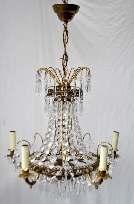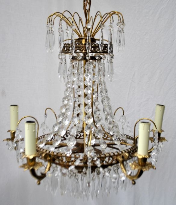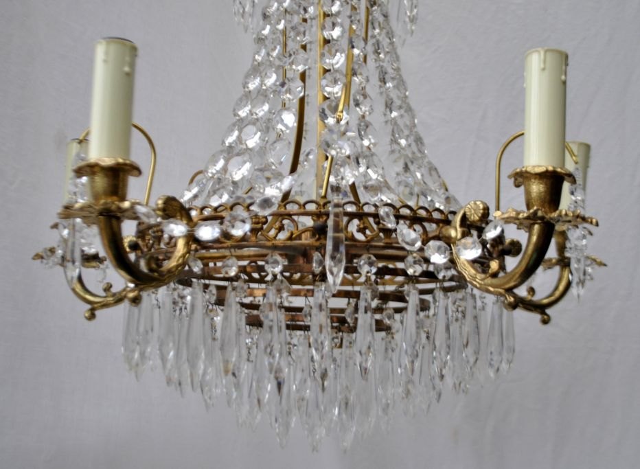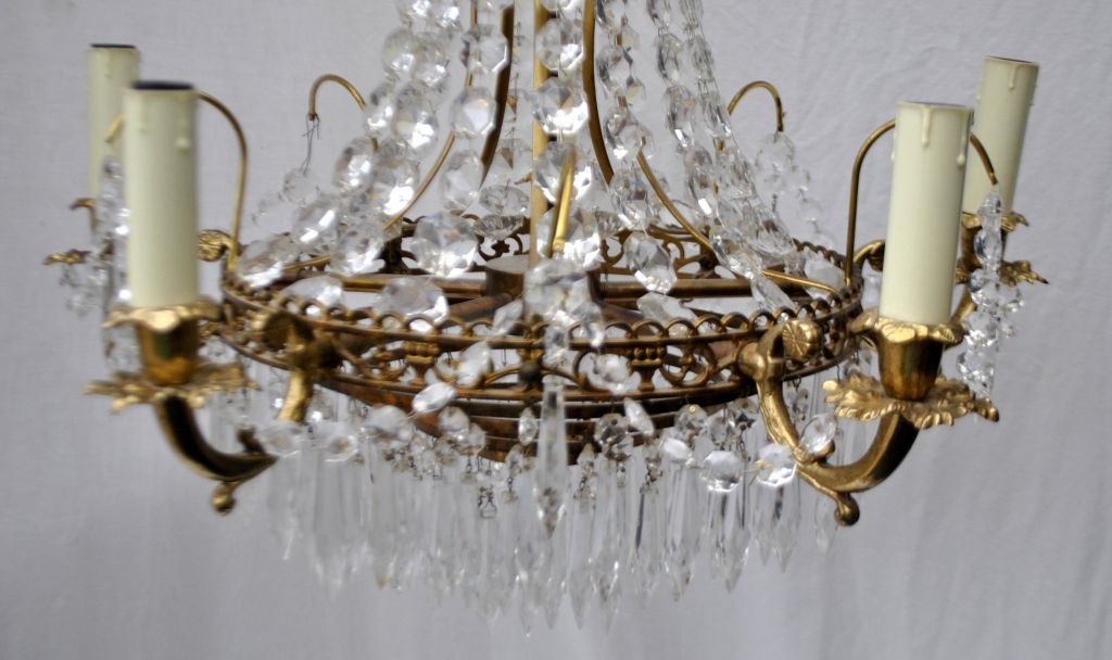 Prisme lysekrone, 20. årh. I messing med dekorationer af blade og guirlander. Til 5 el lys. Antal prismer: 508 stk. H: 75 cm. Dia: 53 cm.