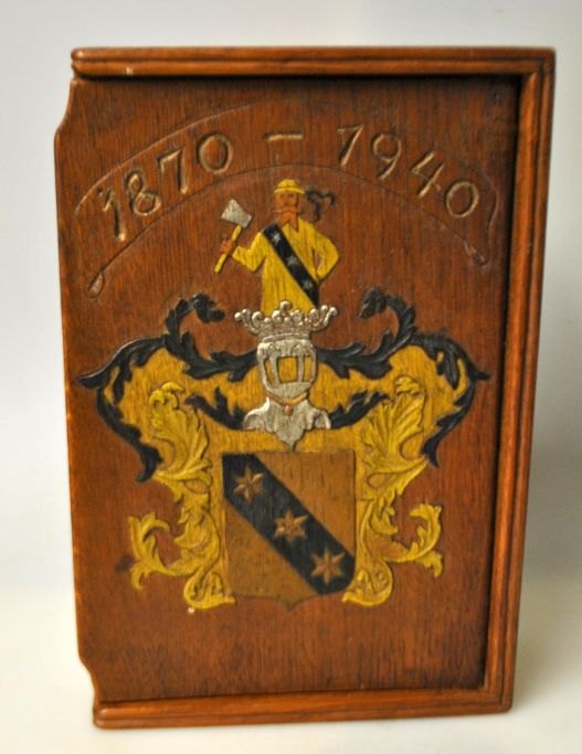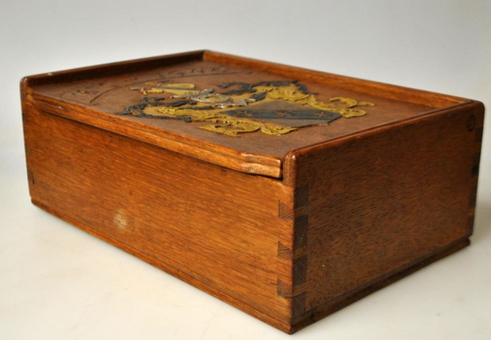 Et dansk egetræs skrin med skæring på låg i form af adelsmærke, 1940. Skrin udformet i forbindelse med jubilæum eller fødsedag. Bemalet våbenskjold. H.: 10 cm. B.: 16,5 cm. L.: 25,5 cm.