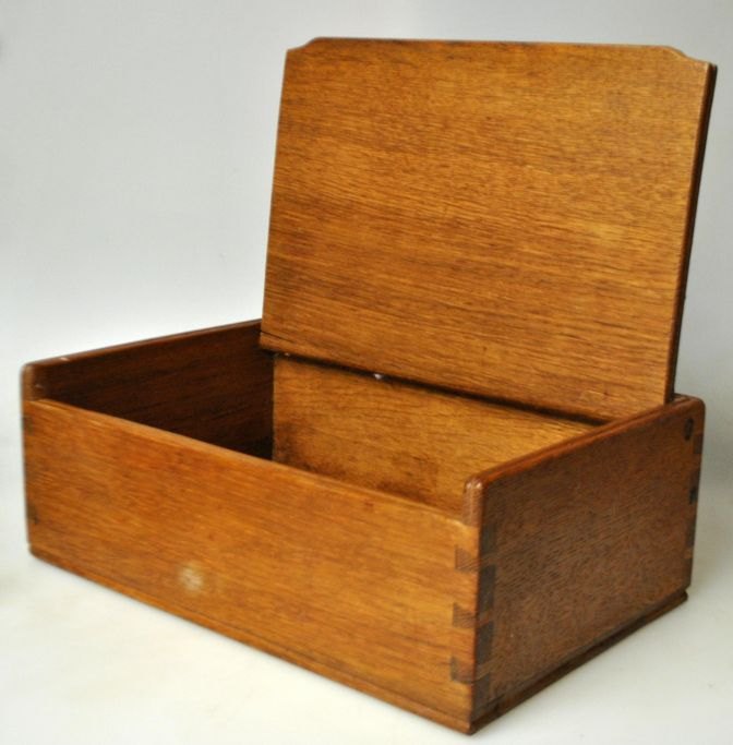 Et dansk egetræs skrin med skæring på låg i form af adelsmærke, 1940.