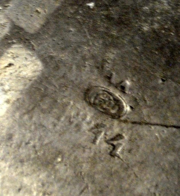Antik gryde med to hanke i tin, 19. årh. Stemplet. Mestermærke og 44. H.: 8 cm. Dia.: 21 cm.