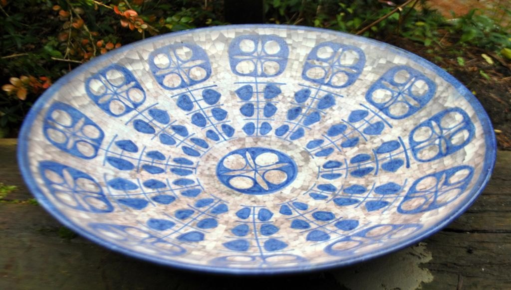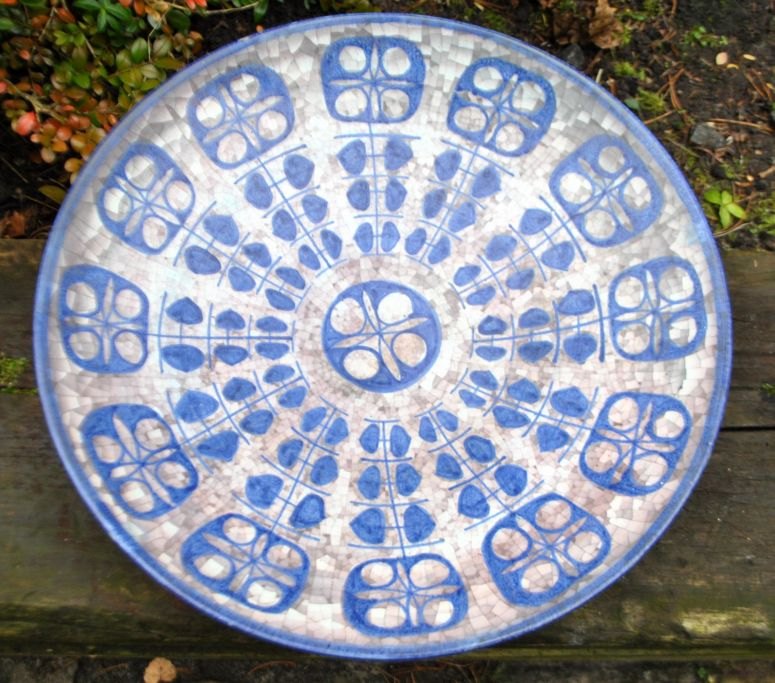Michael Andersen & Søn keramik fad nr. 4106-3, Bornholm, Danmark, efter 1930. Dekoreret i blå/grå nuancer på mosaikbund. Signeret M S og stemplet med tre fisk. Dia: 40 cm.