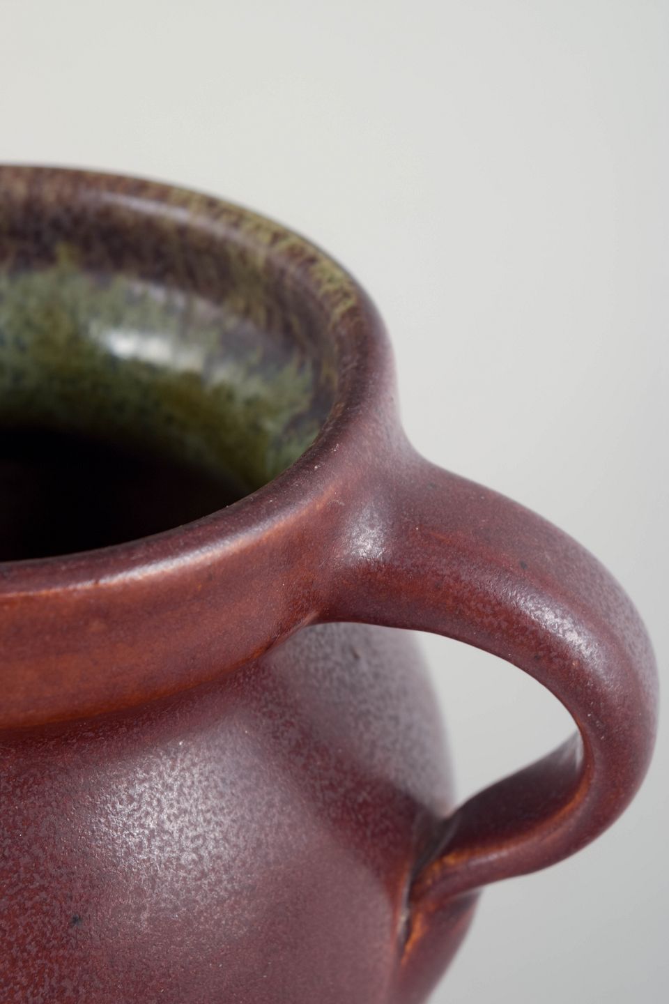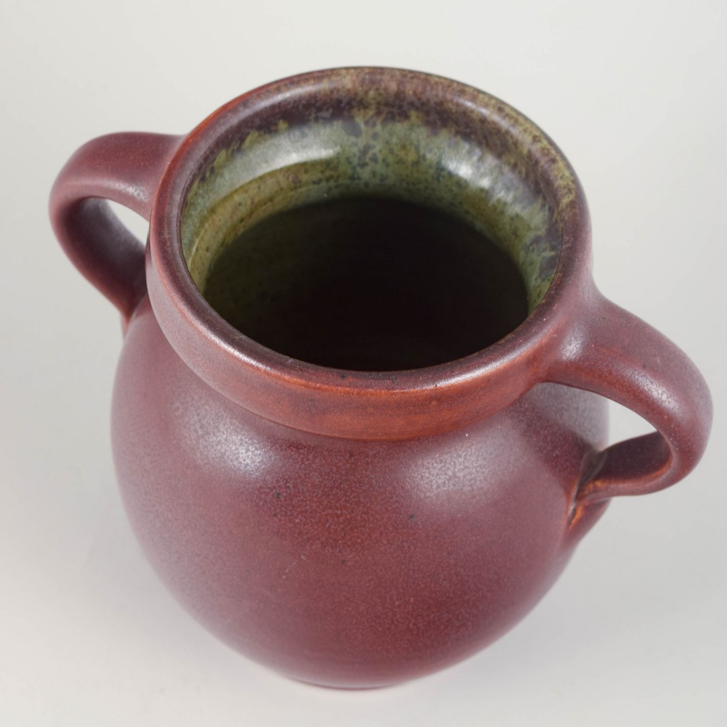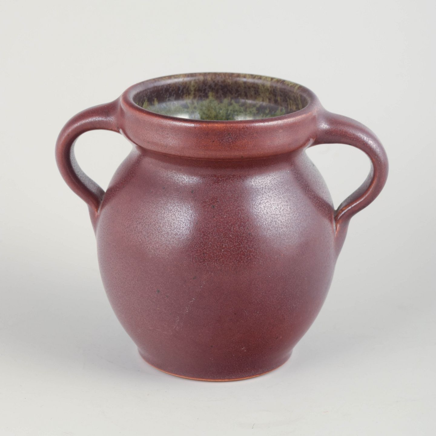 Hånddrejet stentøjsvase i dyb rødviolet glasur med let spil og smukt kontrasterende, flerfarvet indre glasur. Klassisk, blødt buet korpus med elegante dobbelt­hanke.