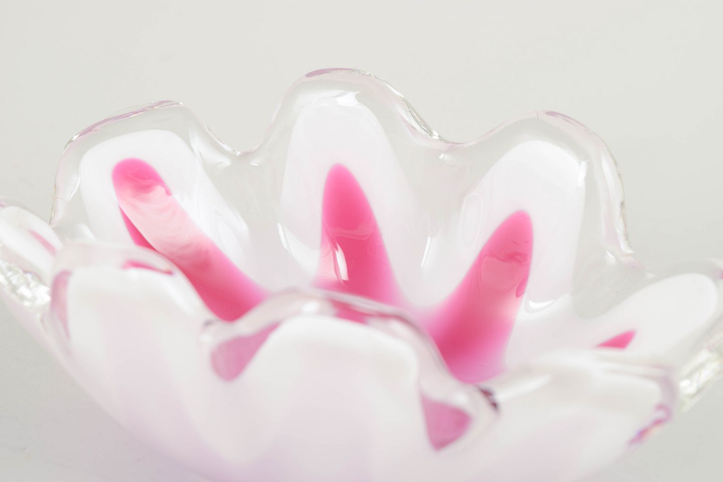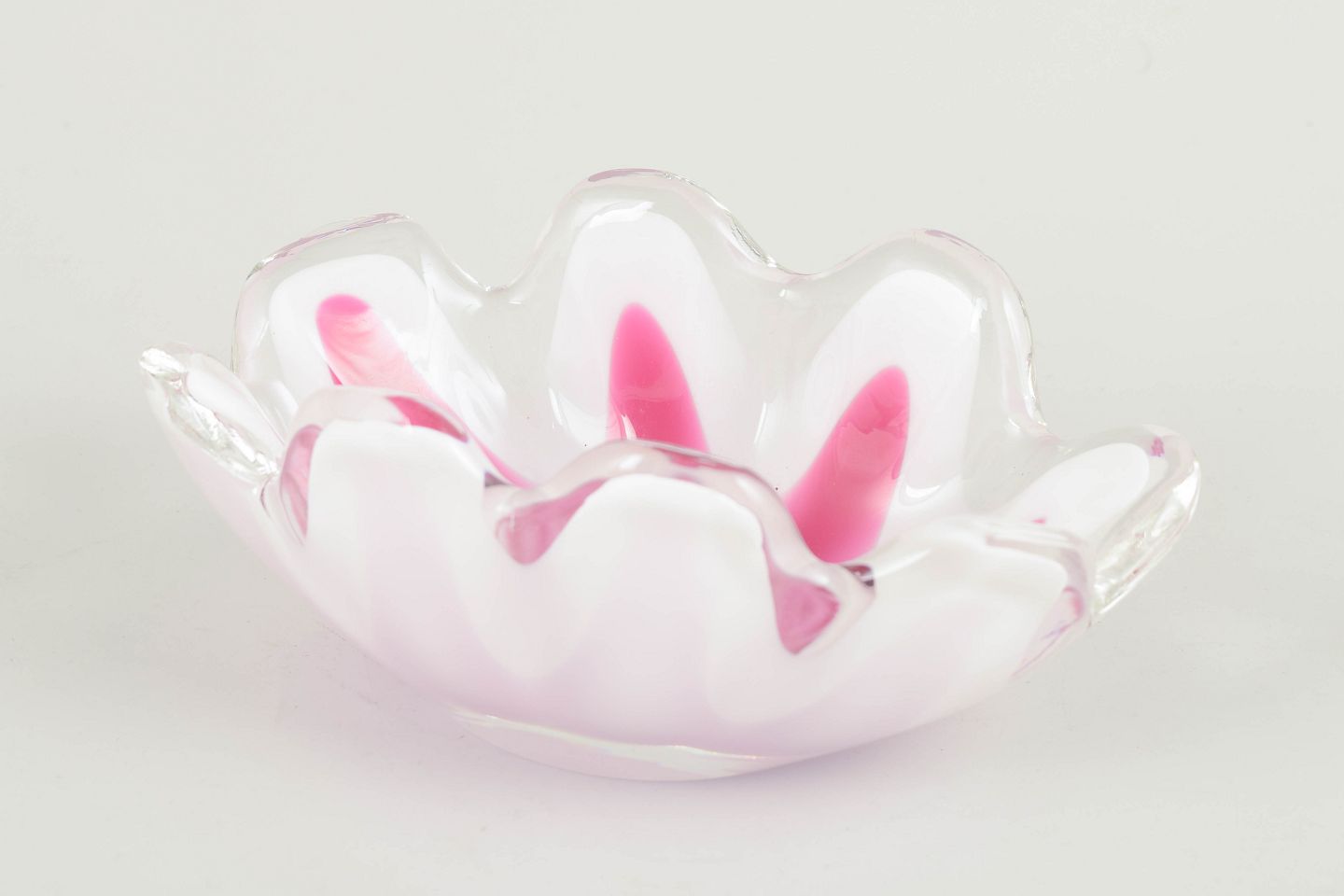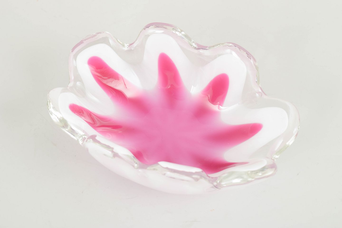 Dekorativ “Coquille”-skål i flerlaget kunstglas med rosa indre farvespil, hvidt mellem­lag og klart yderste glas. Den bølgede, blomsterlignende form repræsenterer en af Kedelvs mere skulpturelle variationer inden for serien.