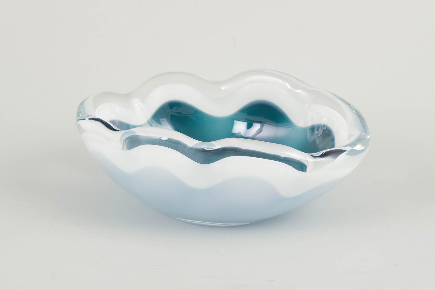 Organisk formet “Coquille”-skål i flerlaget kunstglas med turkis og hvid indre farvelægning samt klar yderste glaslag.