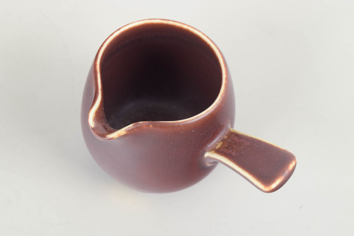 Elegant lille flødekande i rødbrun, mat glasur med afrundet korpus og karakteristisk sidehåndtag – et formsprog, der er typisk for Nylunds skulpturelle og funktionelle design. Den varme glasur og de bløde linjer giver genstanden et harmonisk, moderne udtryk.