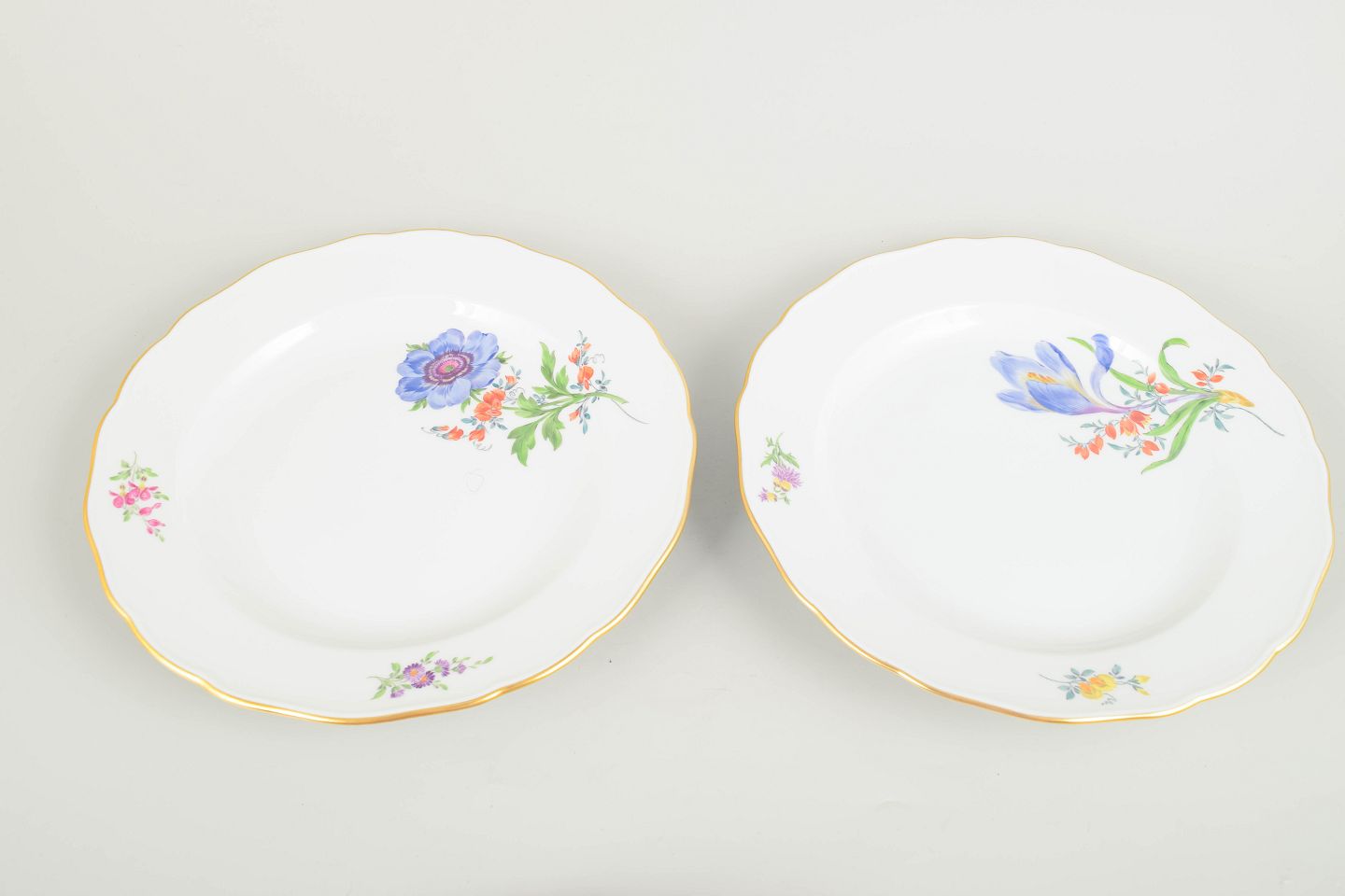 Fire antikke Meissen-tallerkener i porcelæn med håndmalede blomsterdekorationer og forgyldt kant. Klassisk form med svungen rand og detaljerede polykrome buketter, udført i den høje kvalitet Meissen er kendt for.