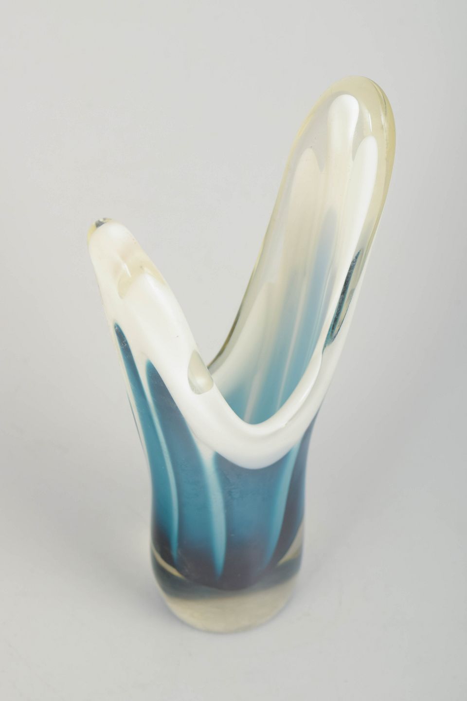 Elegant, organisk kunstglas vase i klart glas med lag i dyb turkis/blå og hvid. Mundblæst i den klassiske V-formede Coquille-silhuet, hvor farvelagene løber op i flydende, skulpturelle bevægelser.