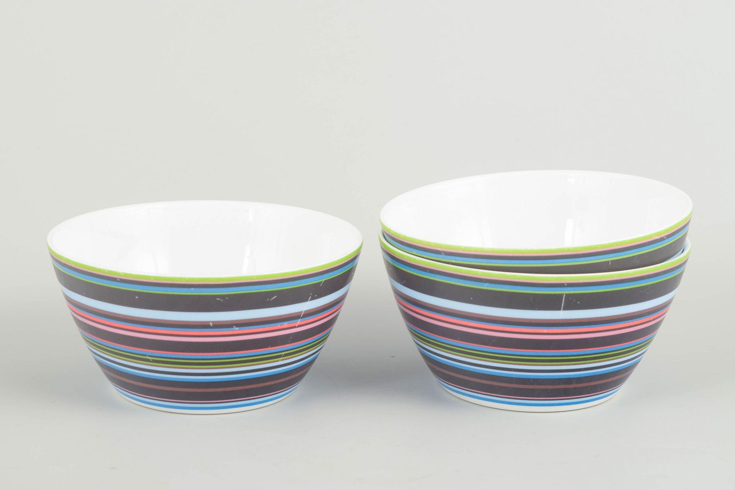 Tre farvestrålende skåle i porcelæn fra den ikoniske Origo-serie, dekoreret med de karakteristiske flerfarvede, horisontale striber. Lettere brugsspor og ridser i dekoren, jf. fotos.