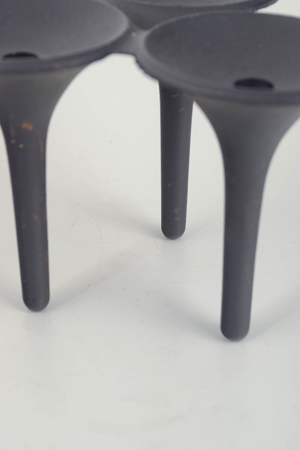Skulpturel, organisk formet lysestage i sortlakeret støbejern, udført i Quistgaards karakteristiske modernistiske formsprog. De tre koniske ben mødes i en samlet top med tre skåleformede holdere.