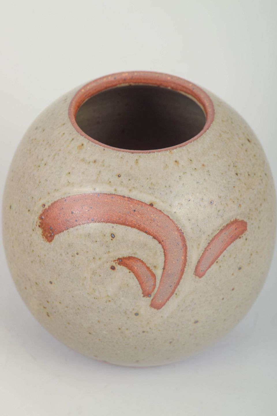 Hånddrejet stentøjsvase i afrundet, organisk form. Udført i Palms karakteristiske rå, taktile udtryk med en todelt, mat glasur: øverste del i lys, kalket tone og nederste del i støvet rosa. Et elegant og harmonisk eksempel på Palms mere minimalistiske arbejder fra perioden.