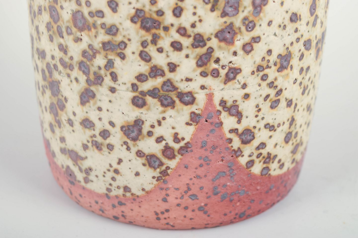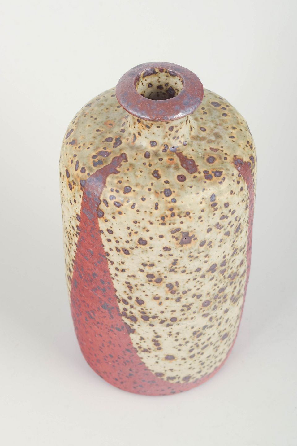 Imponerende hånddrejet stentøjsvase af Rolf Palm, udført i hans atelier i Mölle. Cylindrisk form med let indsnævret hals og karakteristisk, stærkt struktureret overflade. Glasuren er typisk for Palm: en levende, næsten vulkansk tekstur i creme, rød og brune nuancer, der giver dybde og tydelig materialitet.