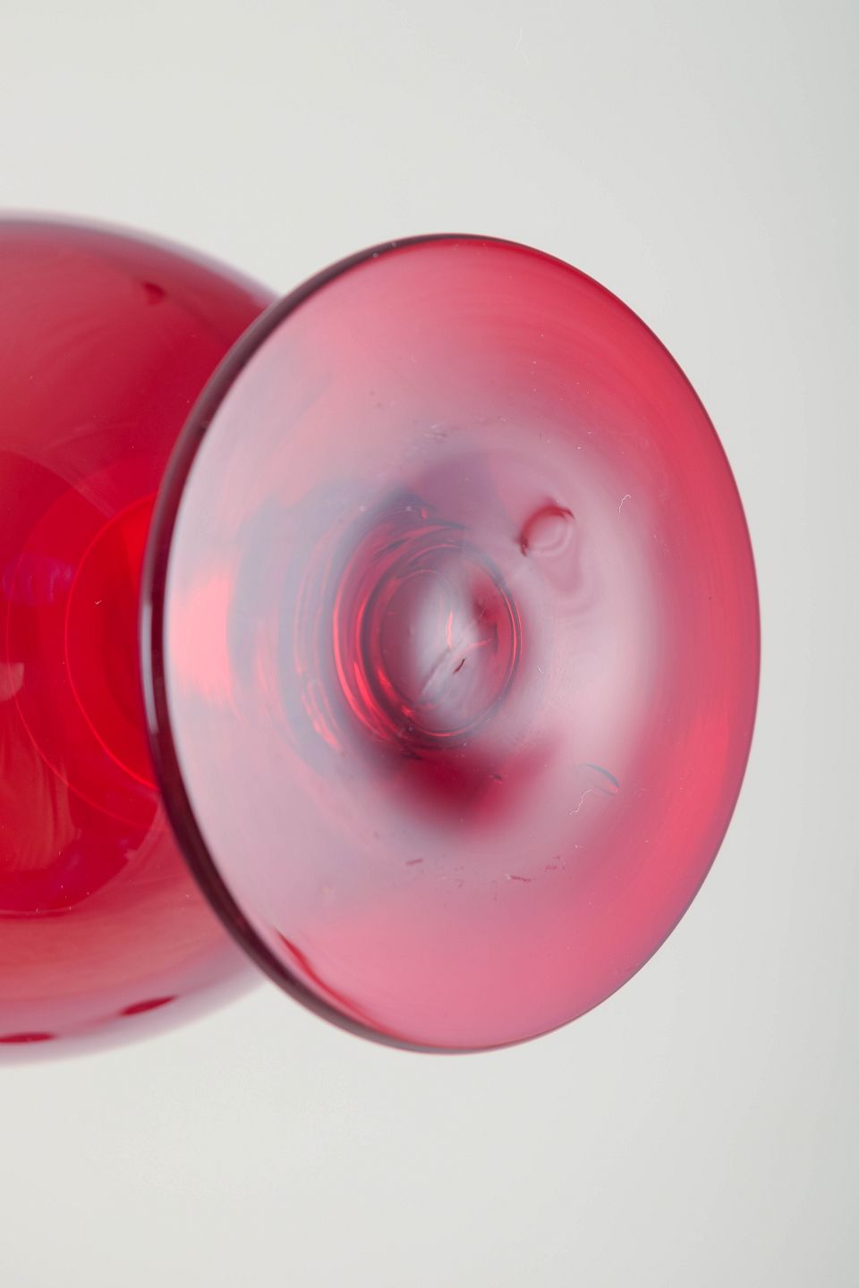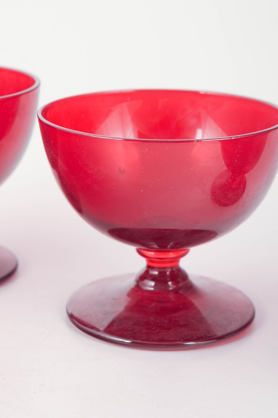 Sæt af tre rubinrøde dessertglas i klassisk, let udadsvungen form på lav fod. Smukt farvet glas i den ikoniske Reijmyre-røde tone.