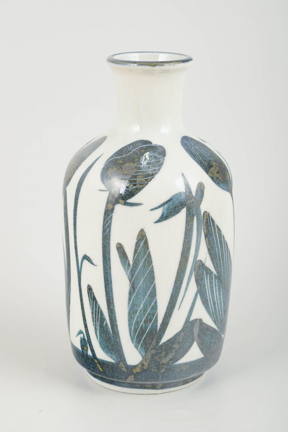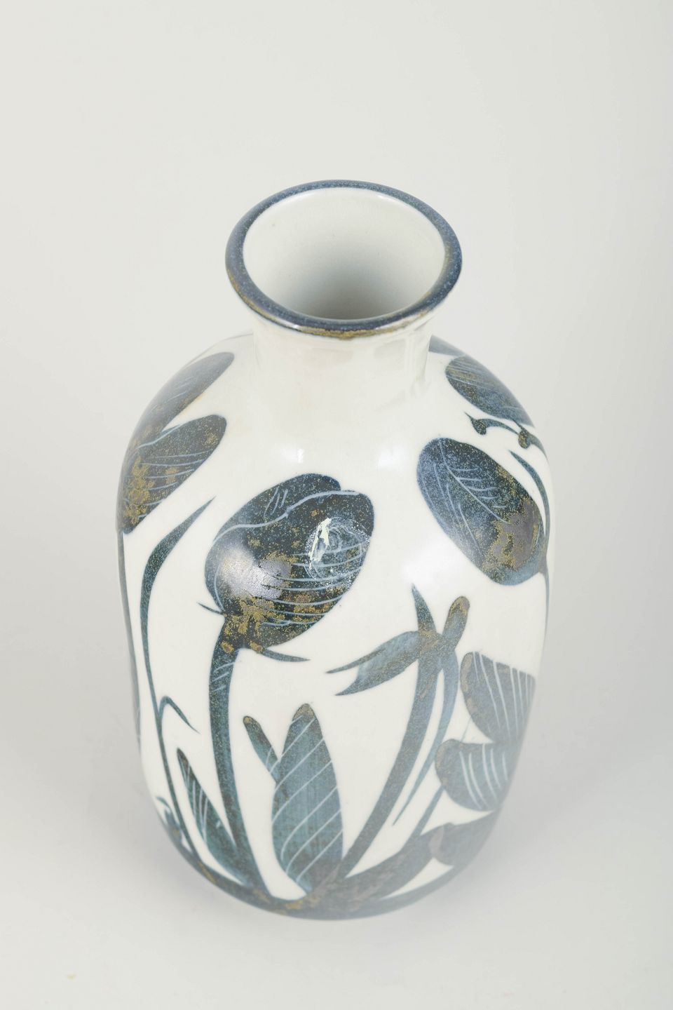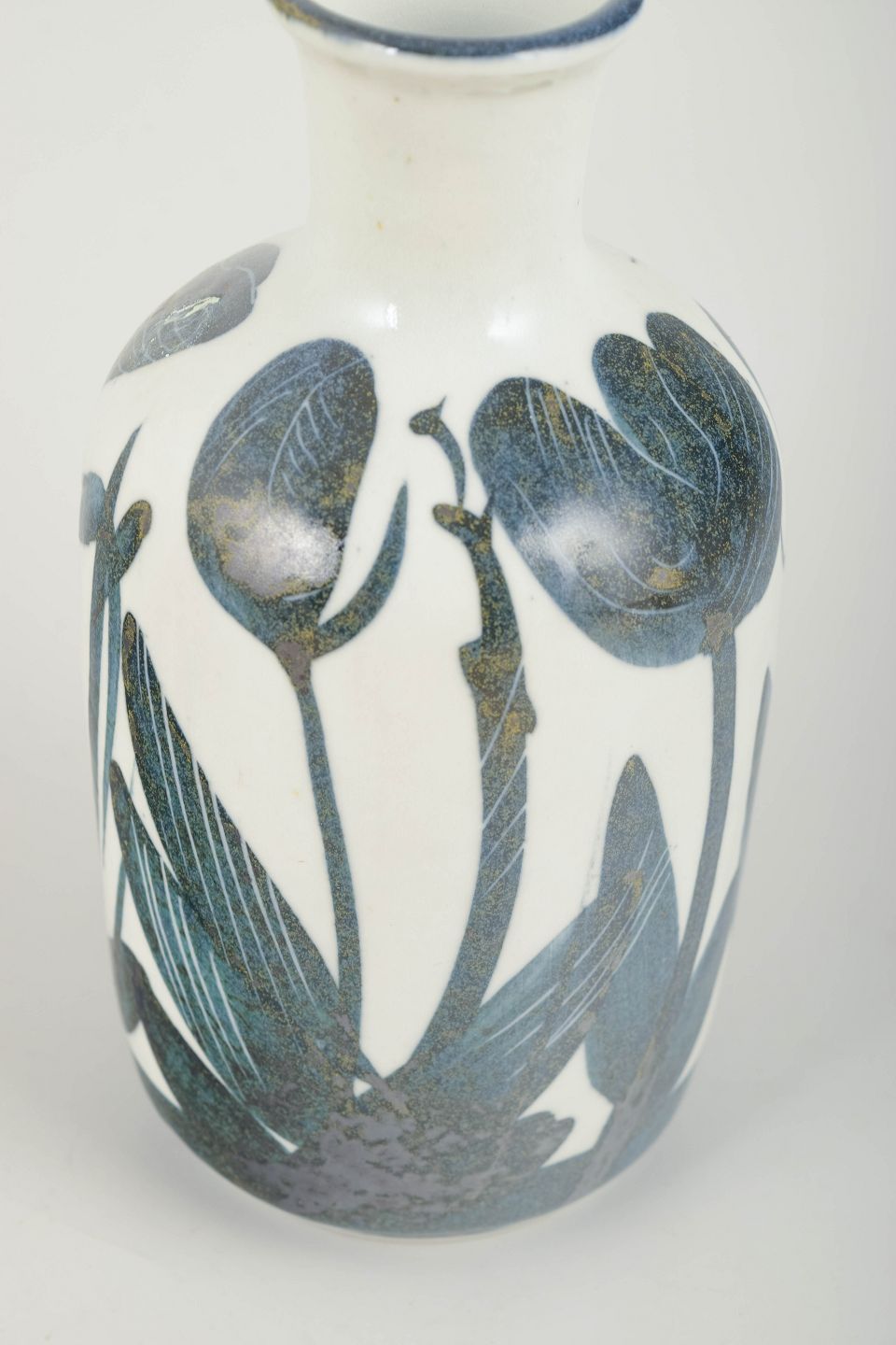 Hånddrejet stentøjsvase med mat hvid bundglasur og dekorativt håndmalet blomster- og bladmotiv i dybe blå og sorte nuancer. Et karakteristisk og sjældent arbejde fra Stålhane’s periode hos Designhuset.