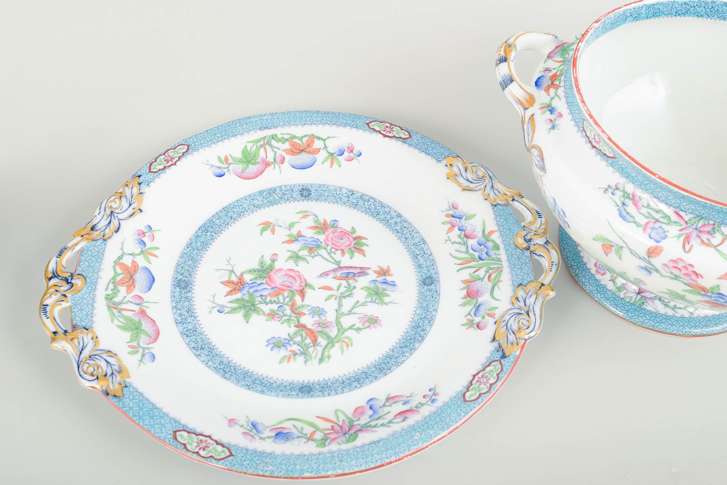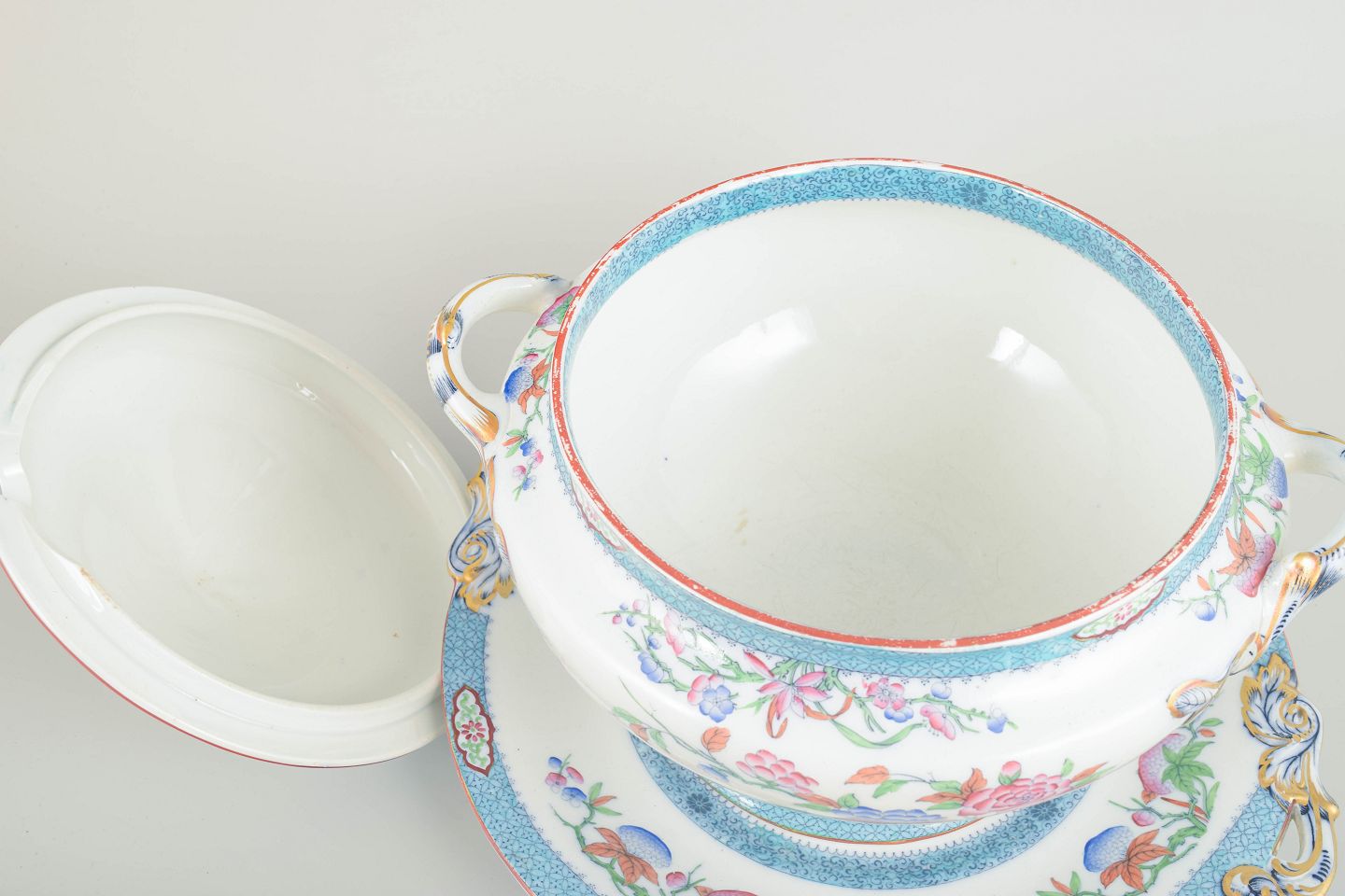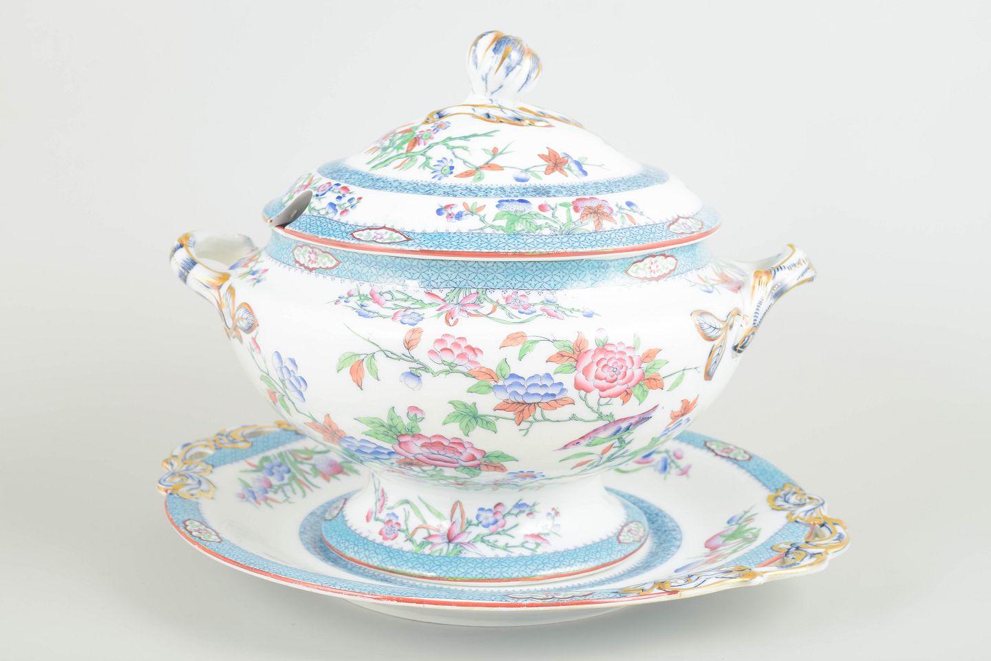 Omfangsrig suppeterrin i fajance med tilhørende underfad, rigt dekoreret i flerfarvet blomsterornamentik og fine bånd i turkise og guldtoner. Terrinen har elegant profilerede hanke og låg med snoet knop.