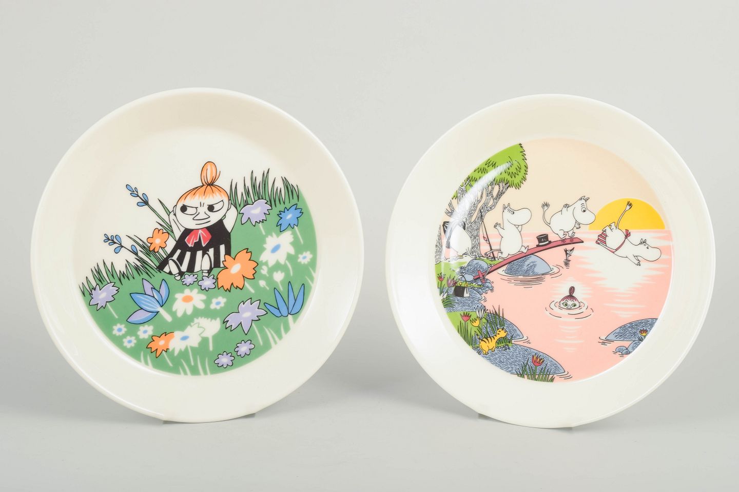 To dekorative tallerkener i porcelæn med klassiske Mumi-motiver, udført af Arabia Finland. Farvestærke illustrationer i tidstypisk grafisk stil.
