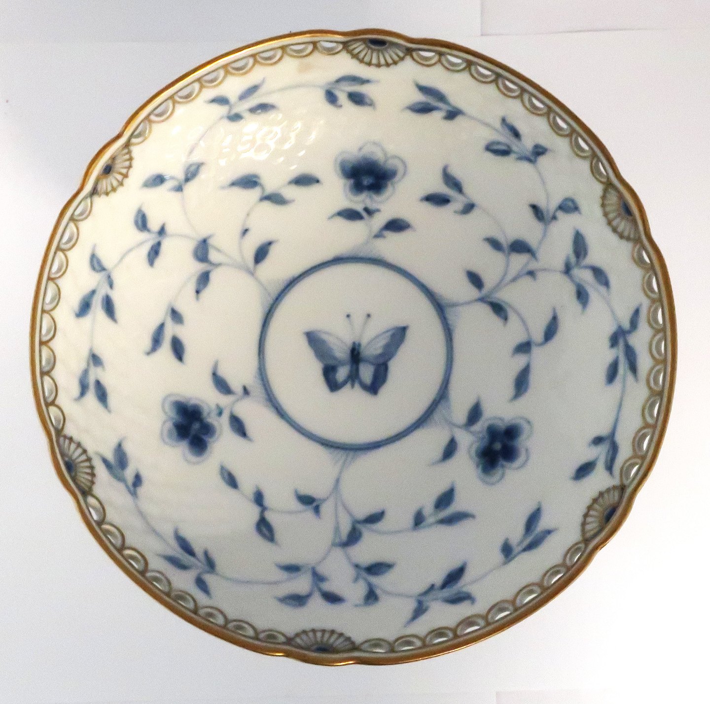 Bing & Grøndahl. Sommerfugl med guld. Kageskål på fod. Højde 14,5 cm. Diameter 20,5 cm. (1 sortering)