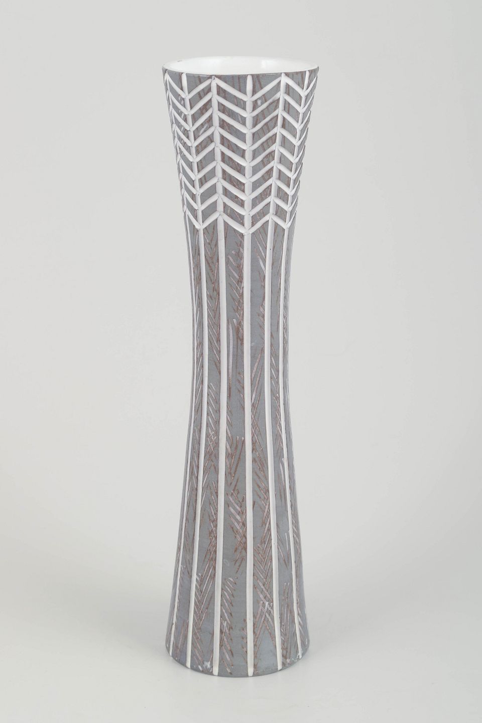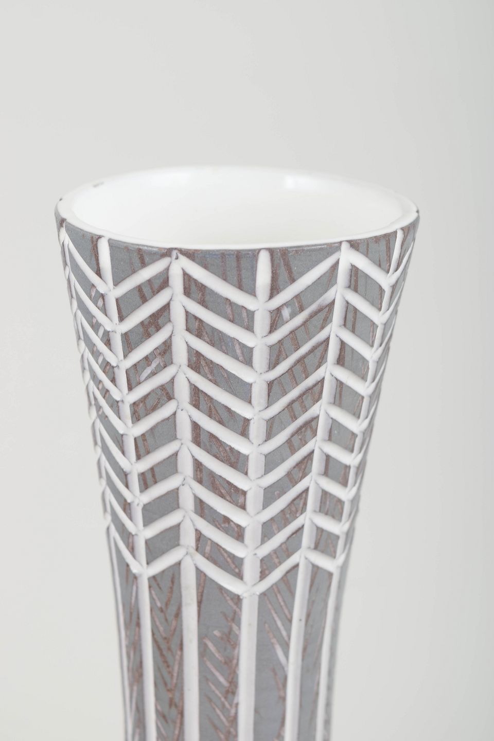 Høj, slank keramikvase i glaseret fajance med karakteristisk geometrisk dekoration i grå og hvide toner, typisk for Simmulsons stilrene og moderne udtryk.