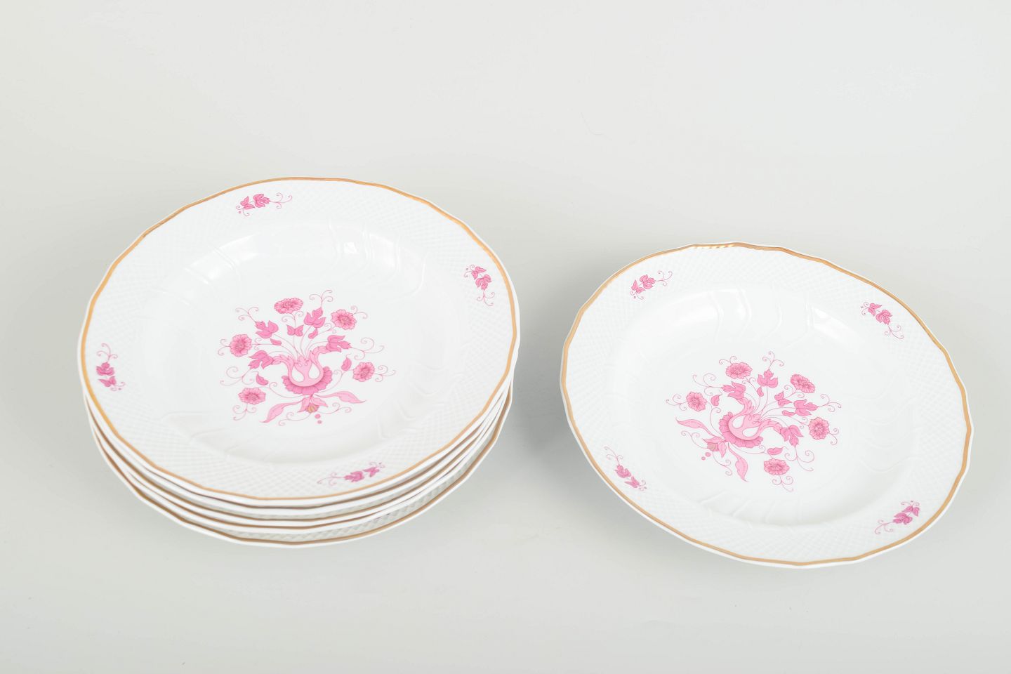 Sæt med seks dybe tallerkener i porcelæn med lyserød blomsterdekoration og guldkant. Klassisk og elegant udførelse fra den ungarske porcelænsfabrik Hollóháza Porcelain Manufactory.