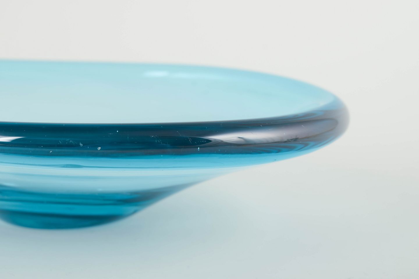 Organisk formet mundblæst skål i turkisblåt glas med tykke vægge og blødt svungen form, typisk for skandinavisk glasdesign fra perioden.