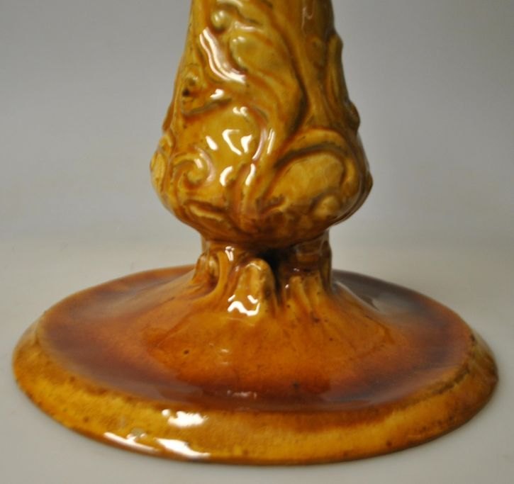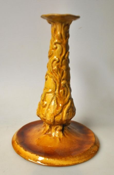 Hammershøj, Svend (1873 - 1948) Danmark: Lysestage. 1904 - 1908. Glaseret lertøj. Gul uran glaseret. Med ornamentik. Udført ved H. A. Kähler i Næstved. H.: 23 cm. Dia. fod: 16,5 cm.
