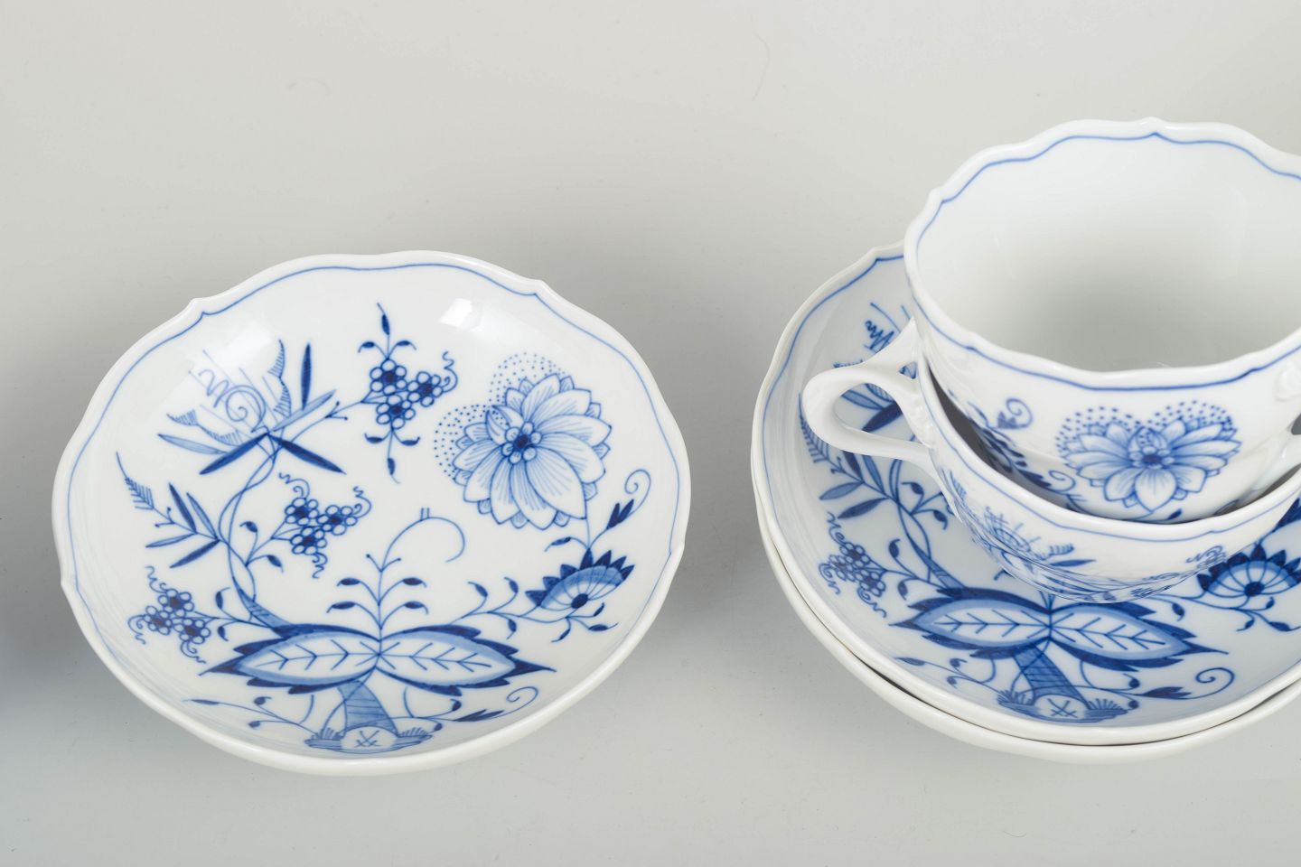 Meissen løgmønstret, tre kaffekopper med tilhørende underkopper.