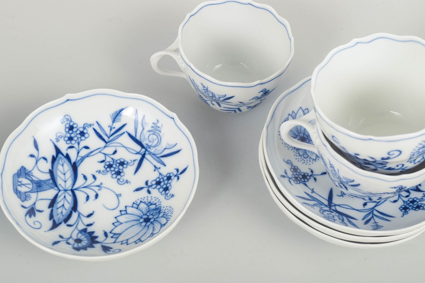 Sæt med fire Meissen-kaffekopper med tilhørende underkopper i det klassiske løgmønstret (Zwiebelmuster).