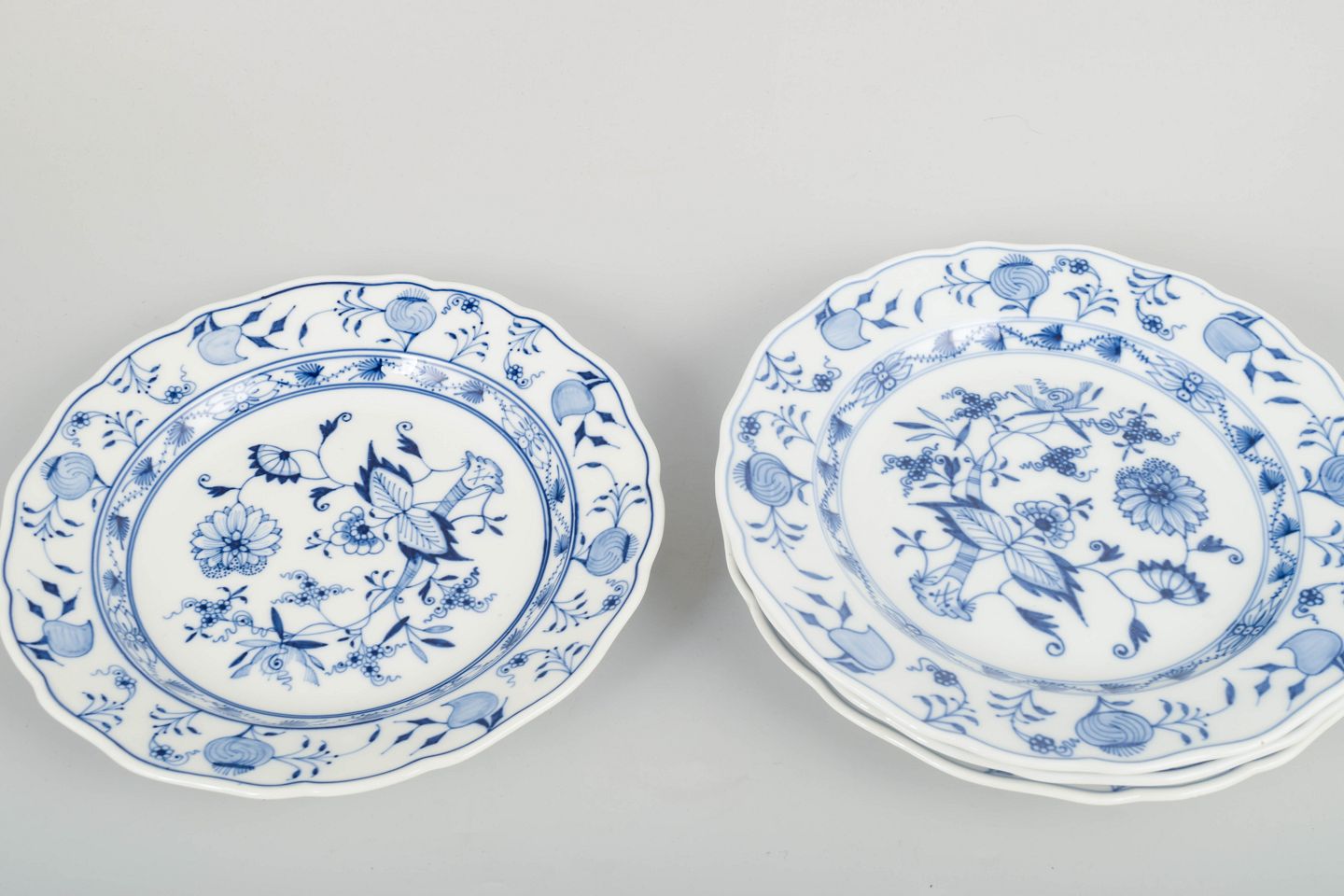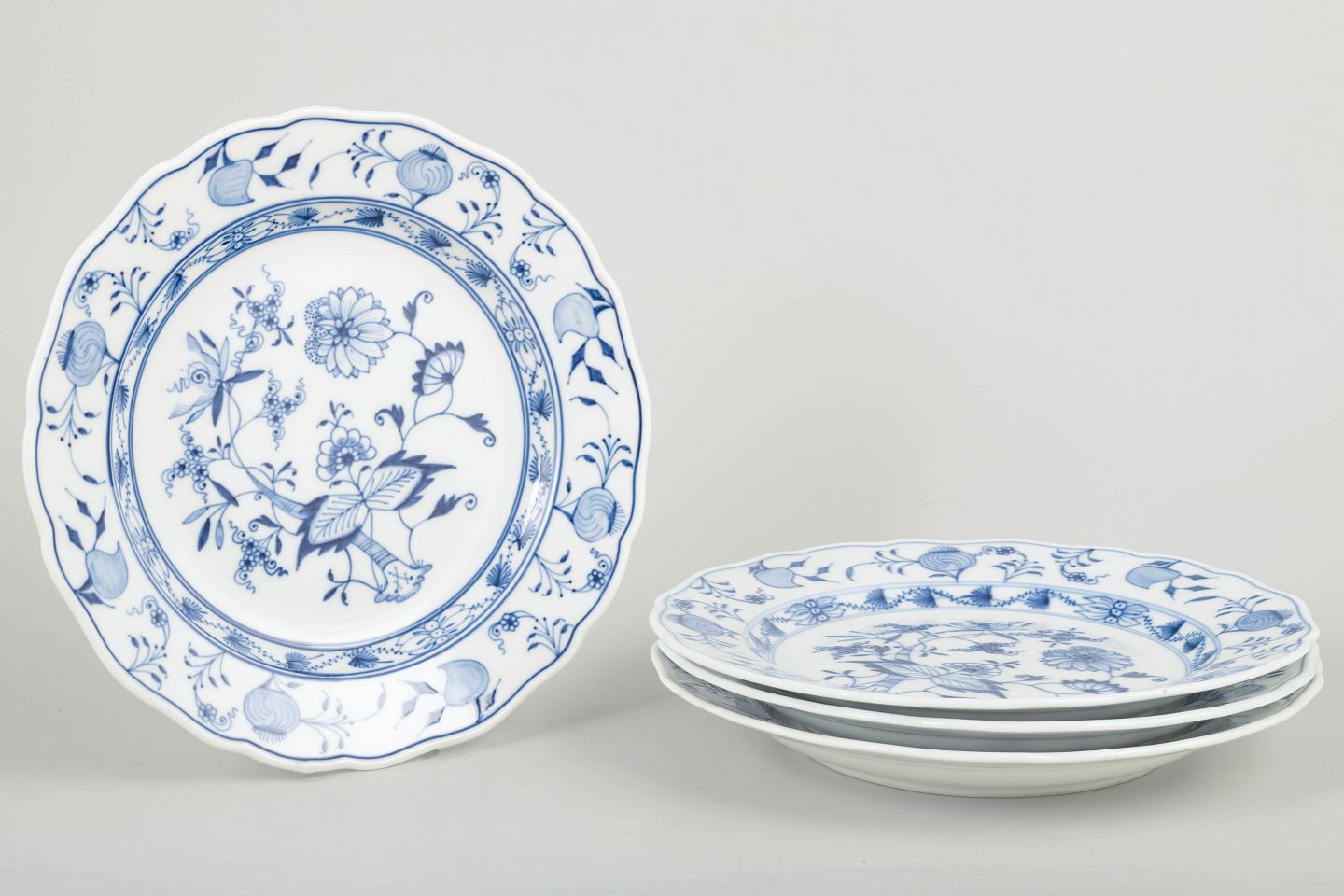 Fire klassiske Meissen-tallerkener i løgmønstret med bølget kant og håndmalet blå underglasurdekoration. Et tidligt 20.-århundredes sæt i fin kvalitet.