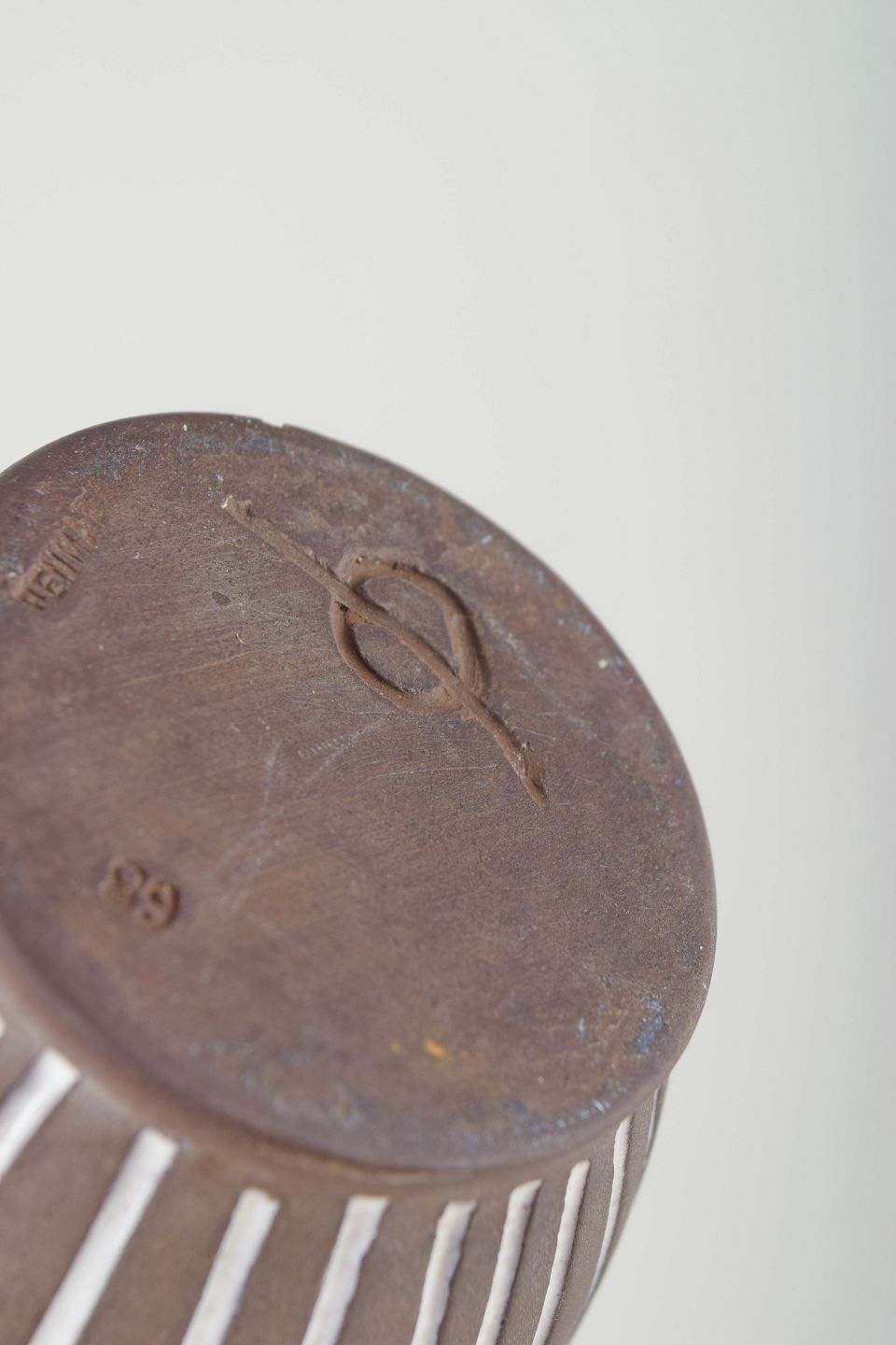 Helge Østerberg (1901–1983) var en markant dansk keramiker med fokus på hånddrejede former og stram, grafisk dekor. Hans arbejder kombinerer klassisk funktionalisme med en tydelig kunstnerisk signatur, ofte udført i jordfarvede glasurer og enkle kontrastmønstre som her. Østerbergs keramik er i dag eftertragtet blandt samlere af nordisk modernisme.