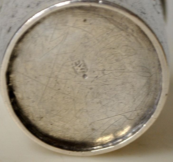 Erik Andersen Winther (1661 - 1725) Sølvsmed i Århus, Danmark: Barokt bæger med indgraveringer: P, N. S. B - A.N.D 1704. Punslet. Stemplet med mestermærke. H.: 6 cm.