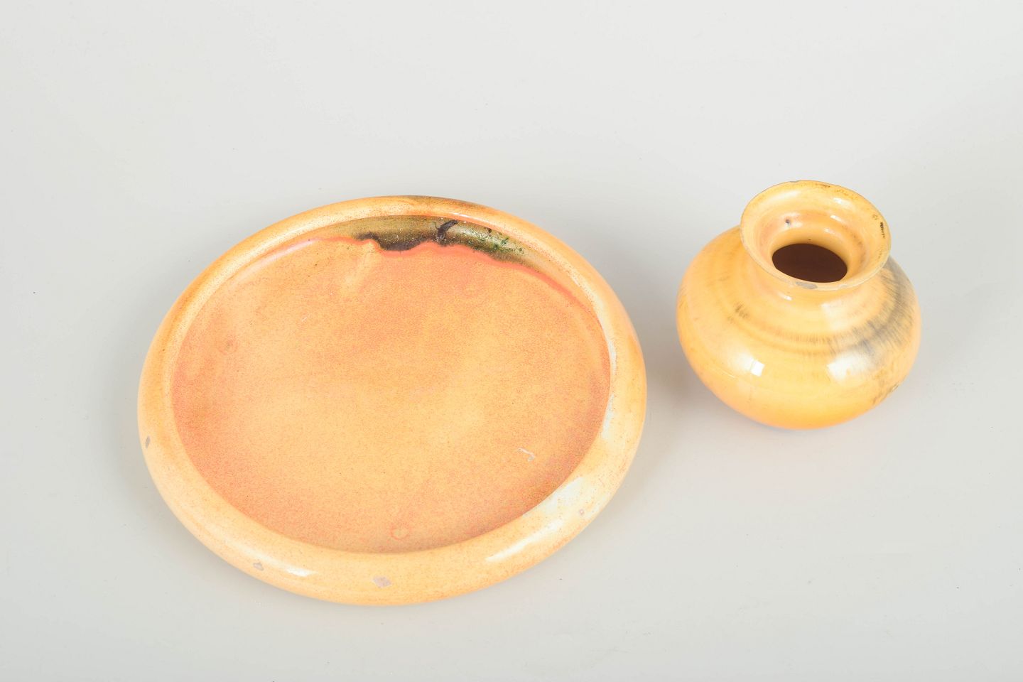 Et sæt bestående af et lavt rundt fad og en lille vase, begge i den karakteristiske orange-gule uran-glasur typisk for Kähler i 1930’erne. Fadet har en blød afrundet kant og levende farvespil, mens vasen har klassisk form med smallere hals og fyldig korpus.