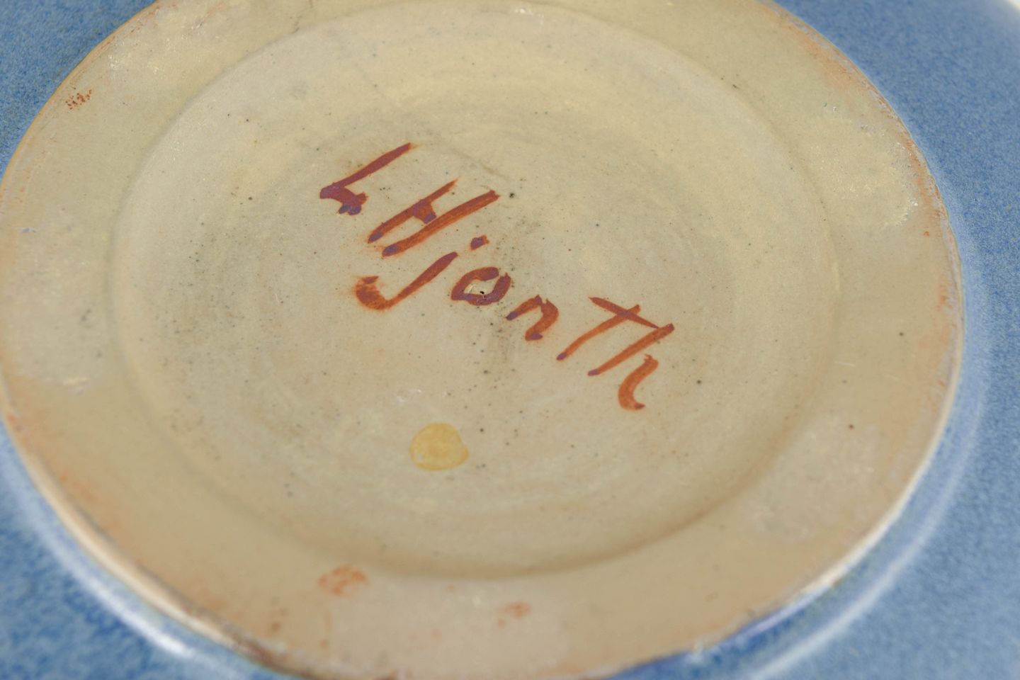 Hånddrejet stentøjsskål i lav, rund form med mat blå glasur i nuancerede toner, typisk for Hjorths eksperimenterende overflader i perioden.