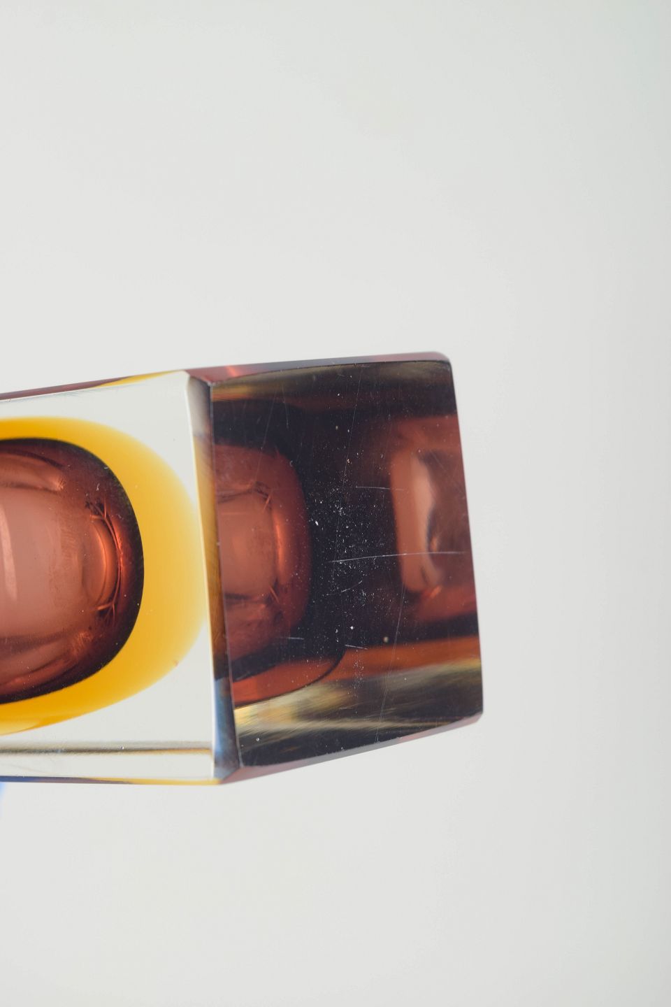 Rektangulær Murano-vase i lagdelt sommerso-glas med klar ydre krop, dyb ametystfarvet indre kerne og varme gule overgange. Et elegant eksempel på 1960’ernes italienske glasdesign, kendetegnet ved skarpe linjer og optiske farvespil.