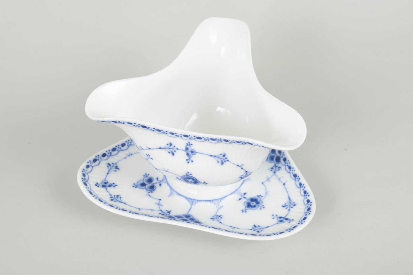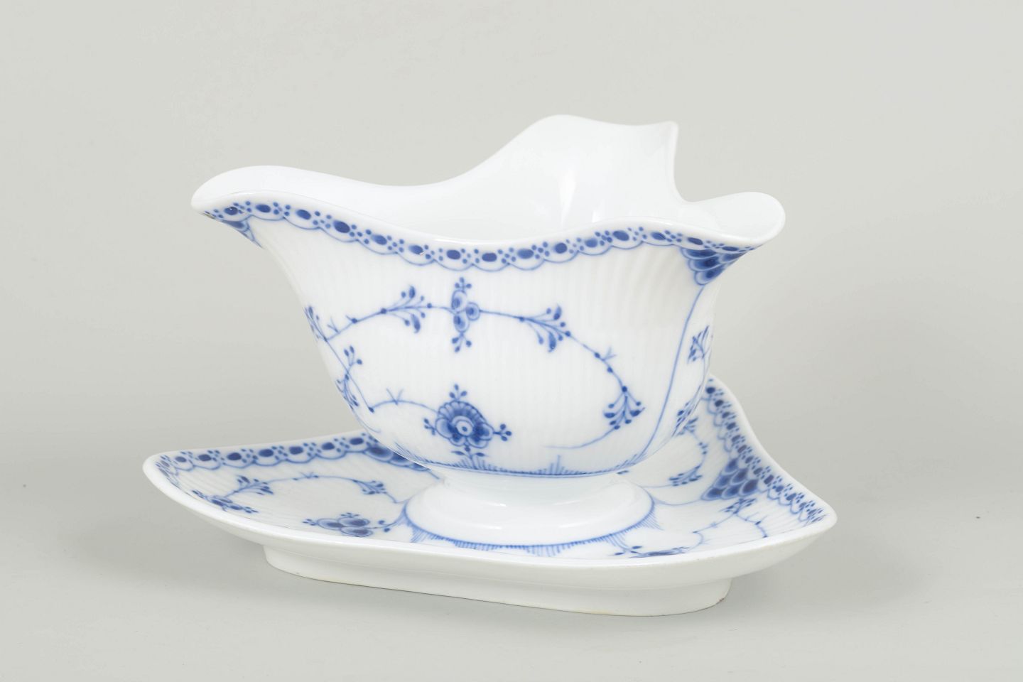 Elegant saucekande, model 1/586, med integreret fad. Klassisk håndmalet dekoration i koboltblå på hvidt porcelæn, udført i Royal Copenhagens tidlige 1900-tals stil. Et smukt eksempel på seriens fine blondedetaljer og organiske formsprog.