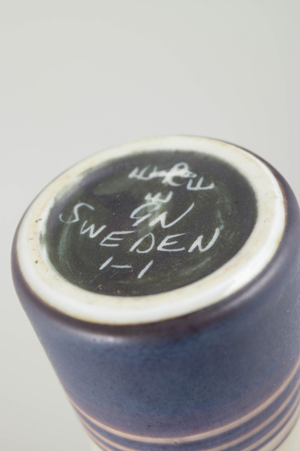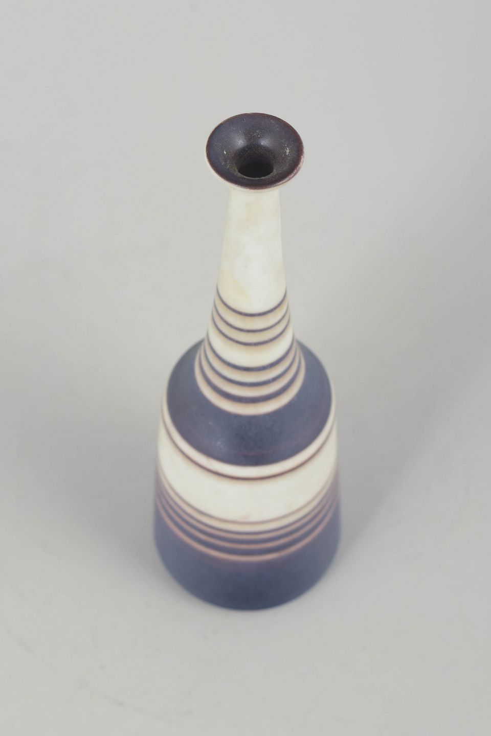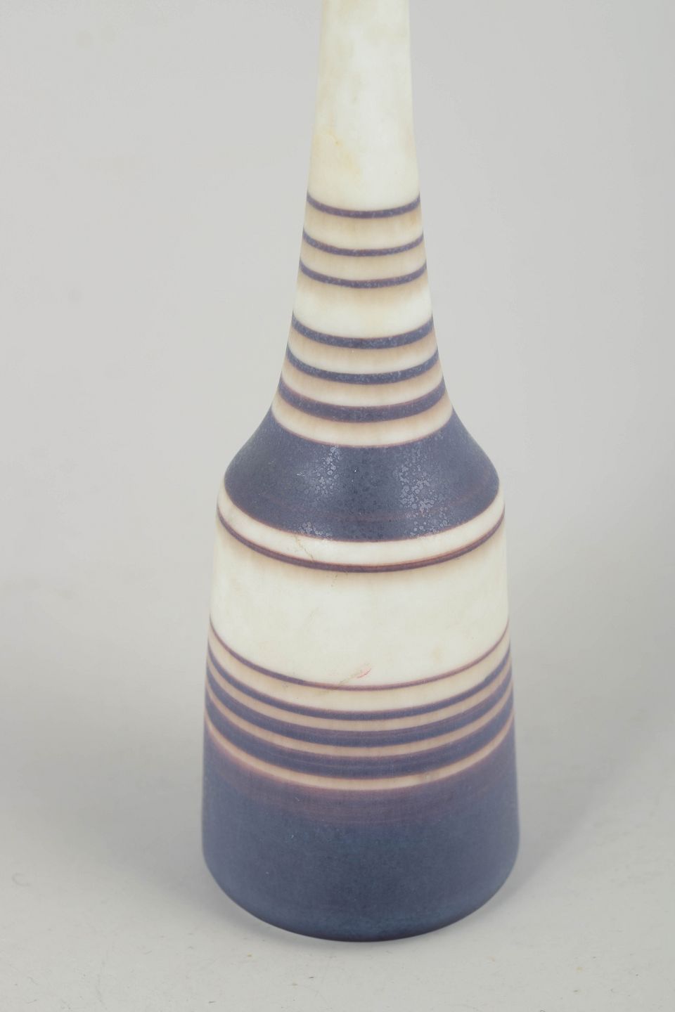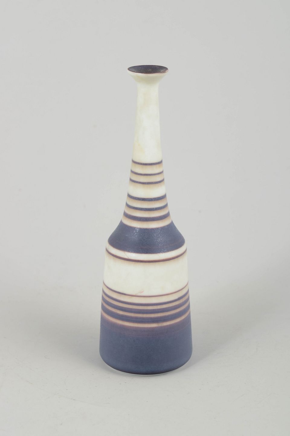 Slank, skulpturel stentøjsvase i et unikt hånddrejet udtryk, dekoreret med Nylunds karakteristiske stribemønster i matte blå, brune og hvide nuancer. Den elegante, langstrakte hals og den harmoniske farvebalance giver vasen et raffineret modernistisk præg.