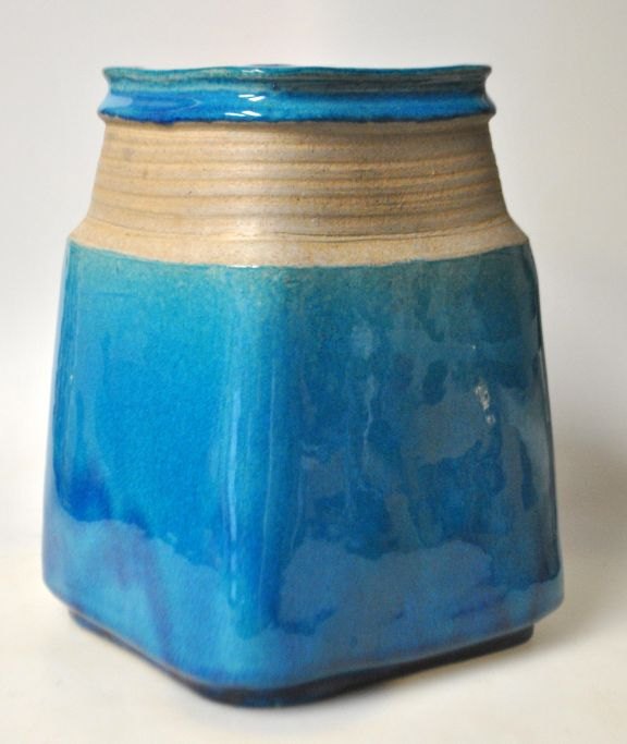 Kähler, Nils Joakim (1906 - 1979): Stor vase. Udført for H. A. Kähler, Næsteved. Turkis glasur. Med kantdekoration. Signeret. H: 23 cm. Dia.: 17 cm.  Perfekt stand!