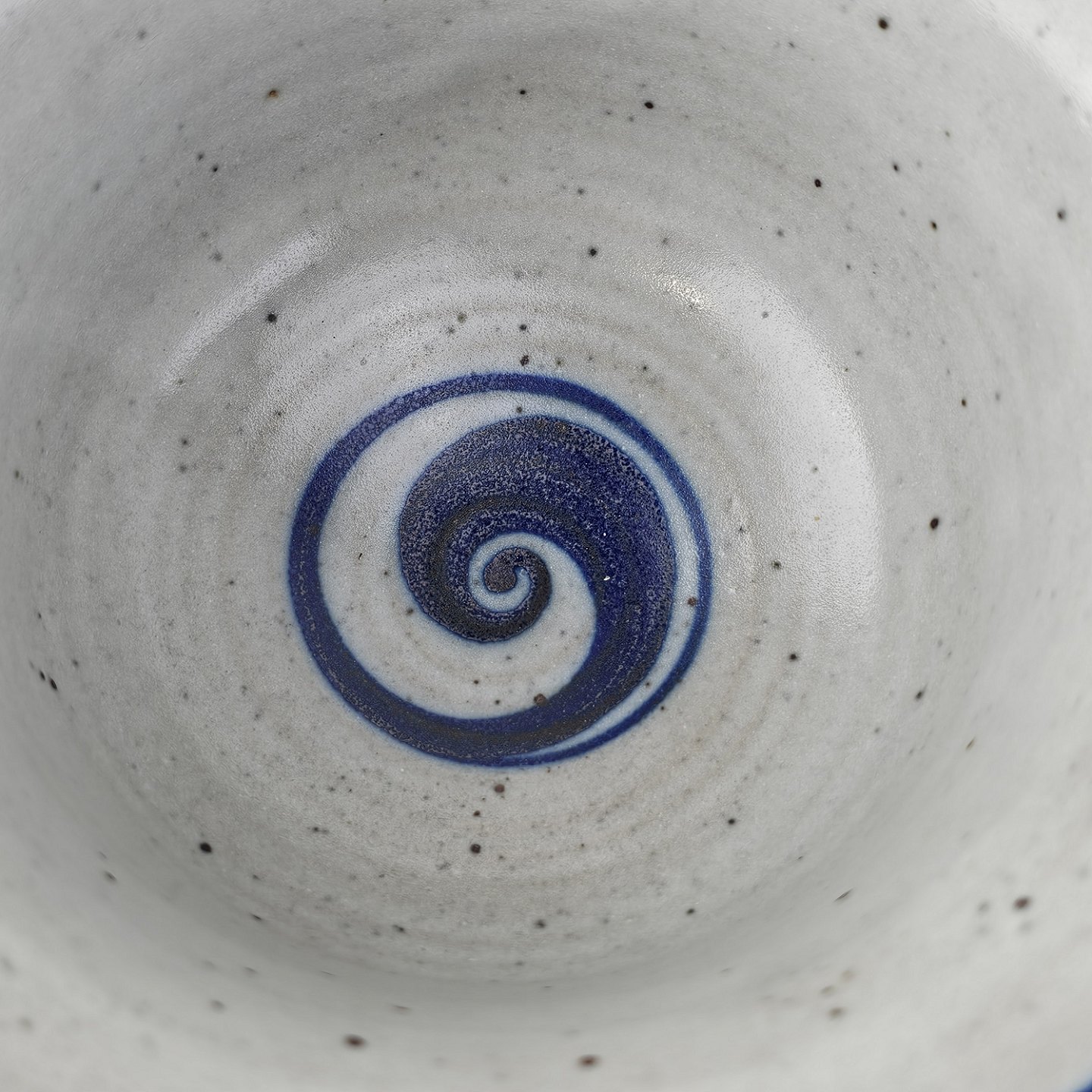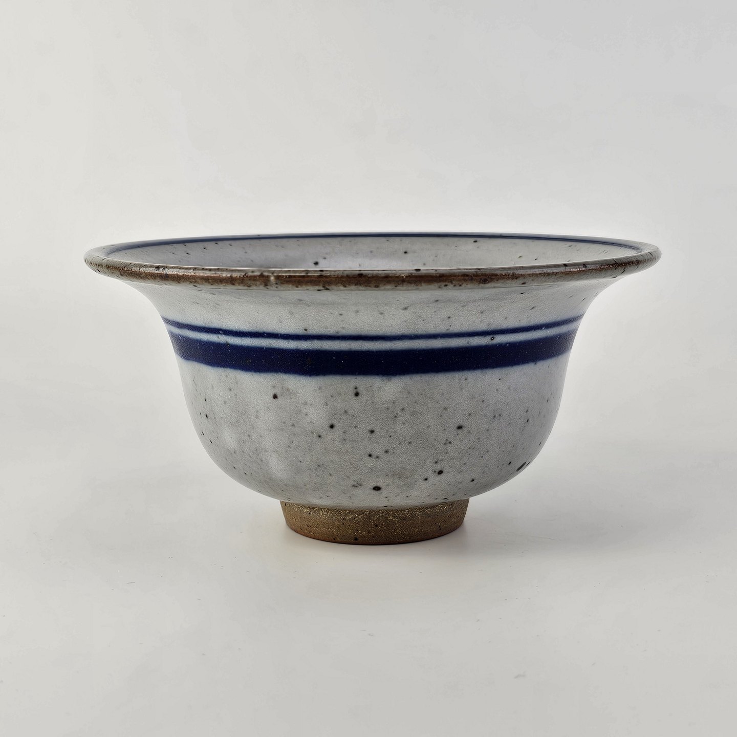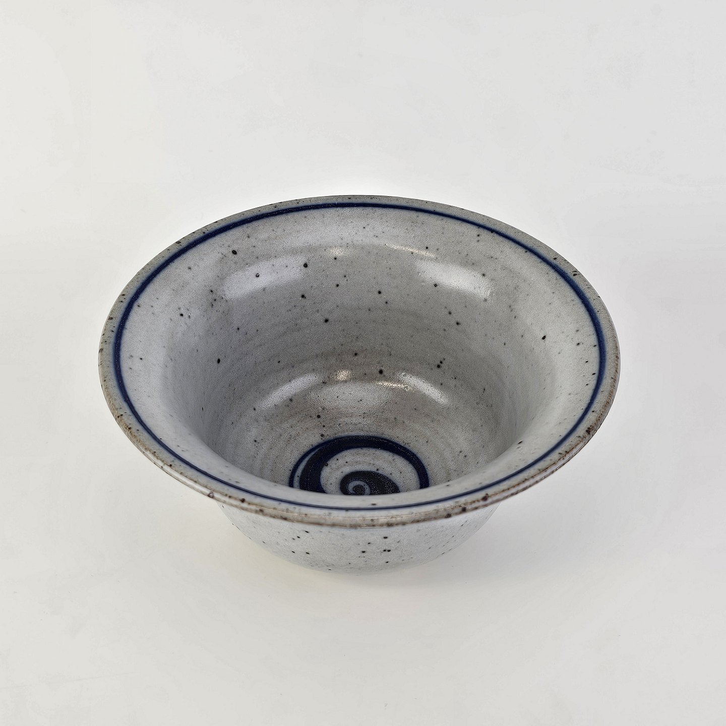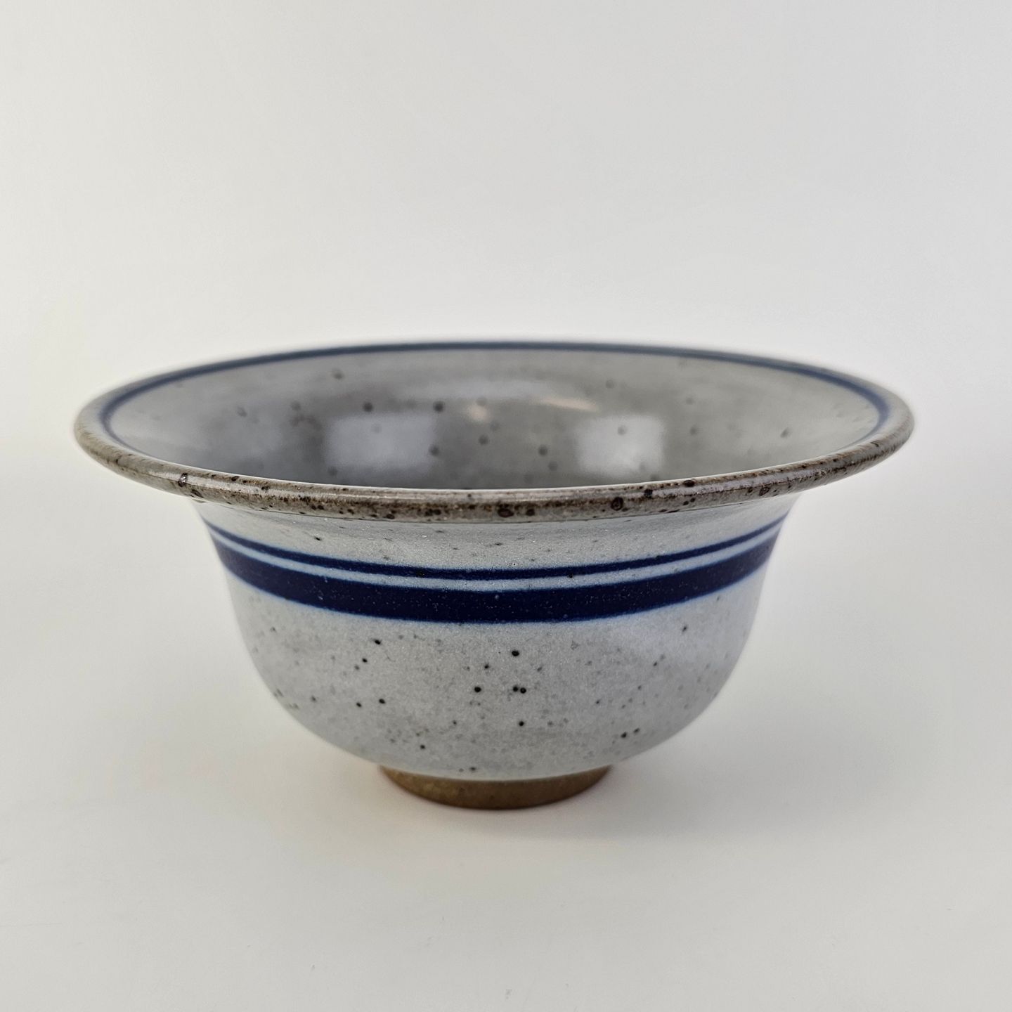 Skål i glaseret stentøj i hvide nuancer med dekoration af blå striber og en blå hvirvel i bunden
