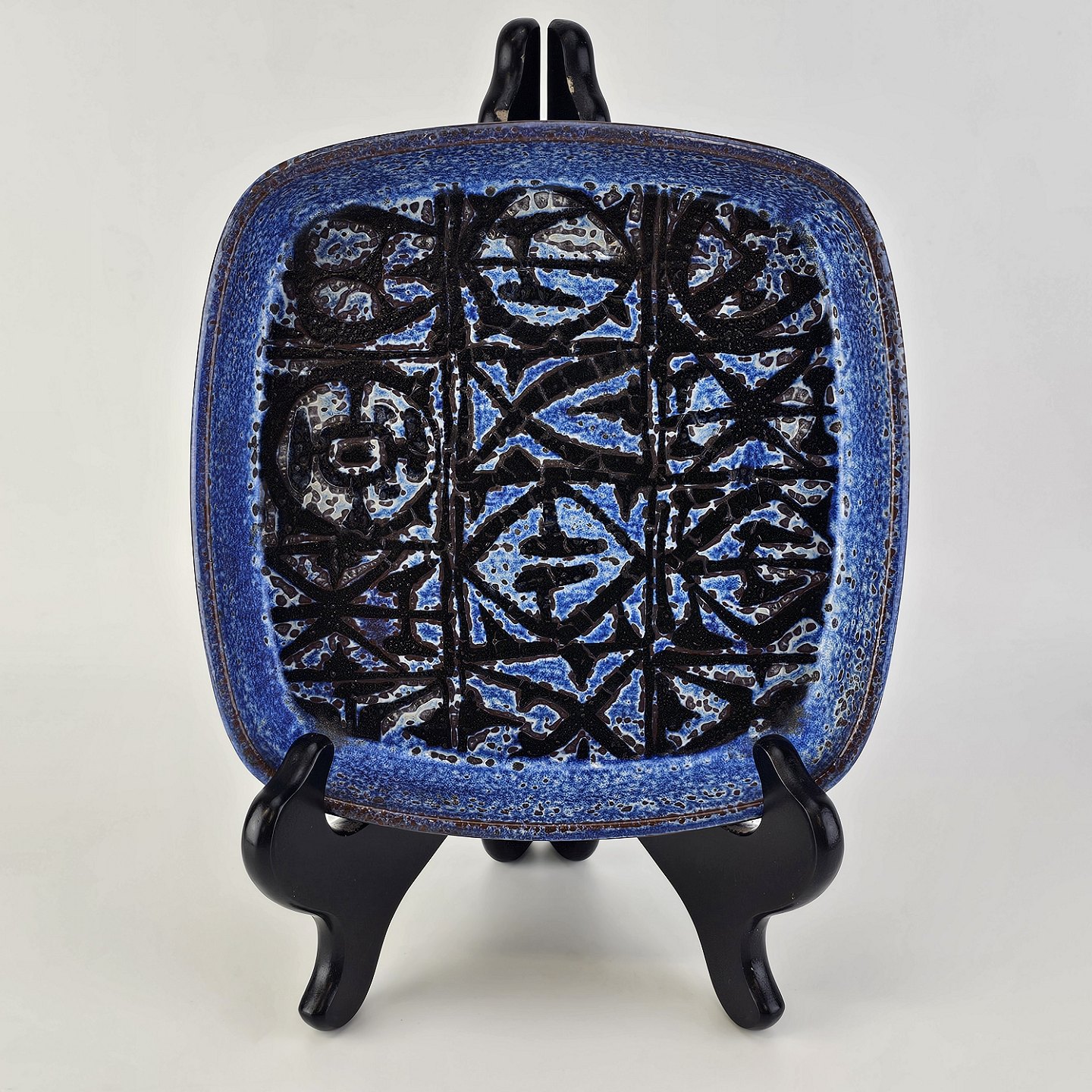 Firkantet skål i fajance fra Baca serien med mønster i blå og sort