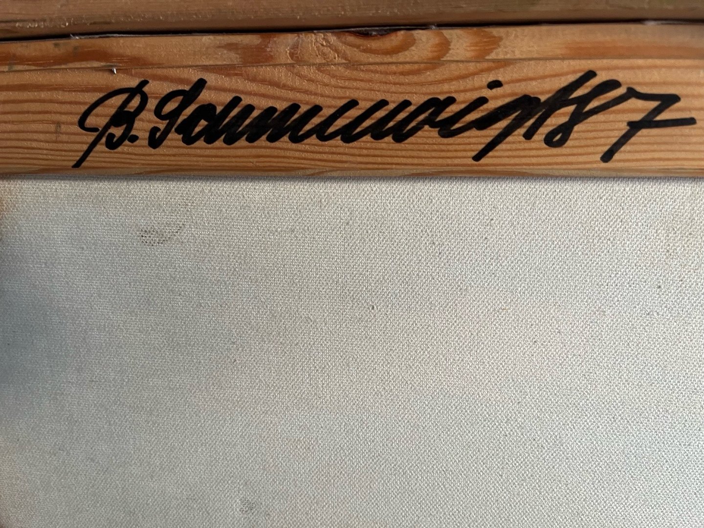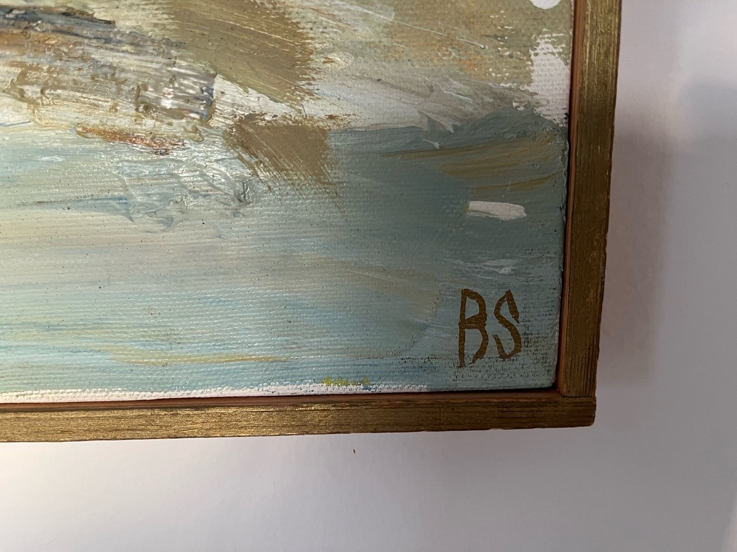 Motiv: Detaljerne i maleriet, især i den venstre del, antyder muligvis en abstrakt kvindelig figur eller en fortolkning af kystlinjer/bølger, hvilket er almindelige motiver i lignende kunst.