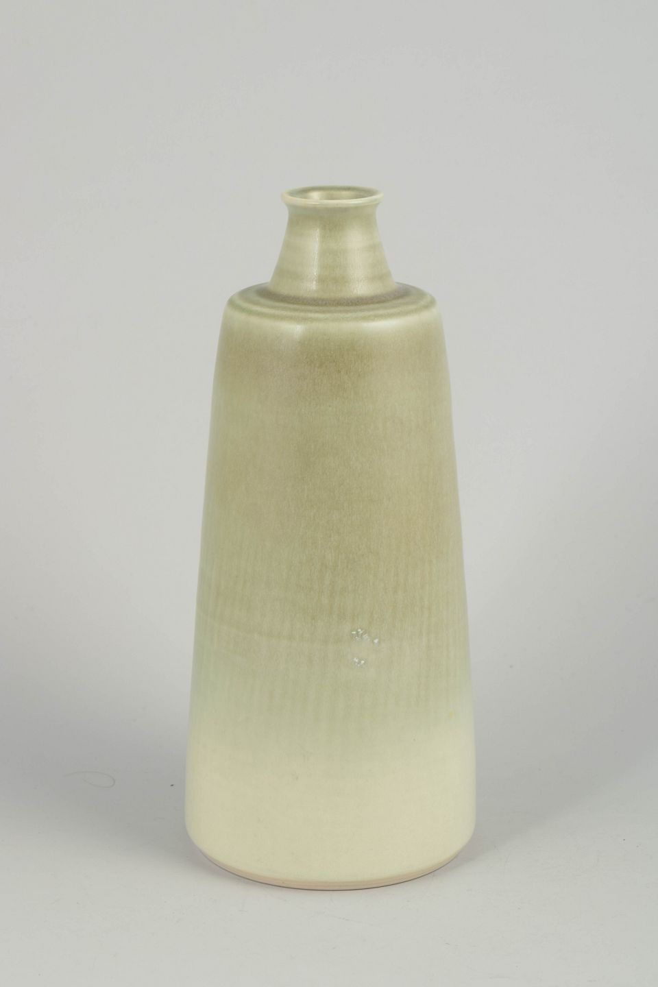Elegant cylindrisk vase i stentøj med den karakteristiske harepels-glasur i bløde beige- og cremenuancer. Den matte, let levende overflade og den slanke form er typisk for Søholms produktion i 1970’erne.
