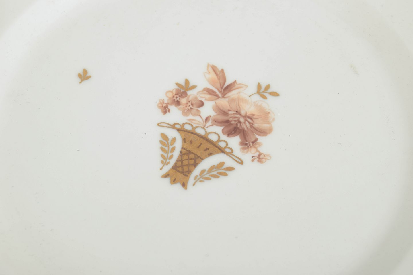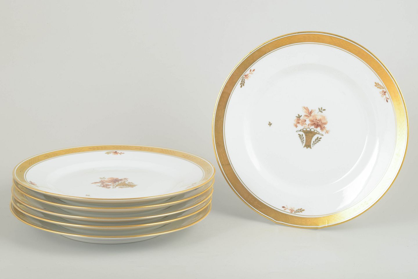 Sæt med seks elegante middagstallerkener i porcelæn fra Royal Copenhagens “Guldkurv”-serie, model 595/9586. Klassisk hvid porcelæn med bred forgyldt kant og håndmalet blomsterkurvmotiv.