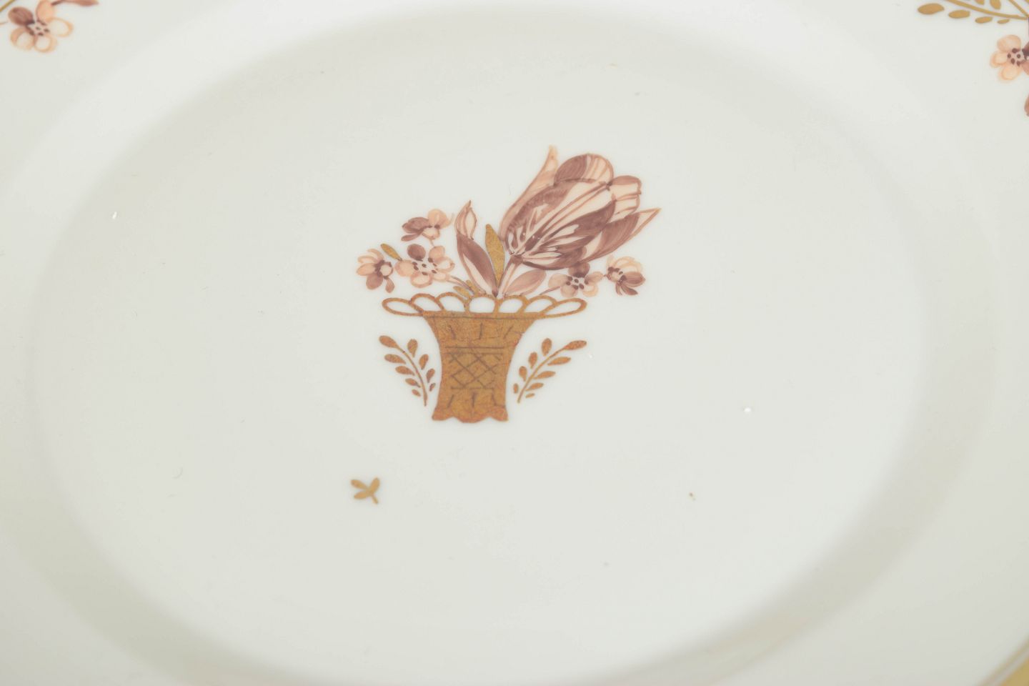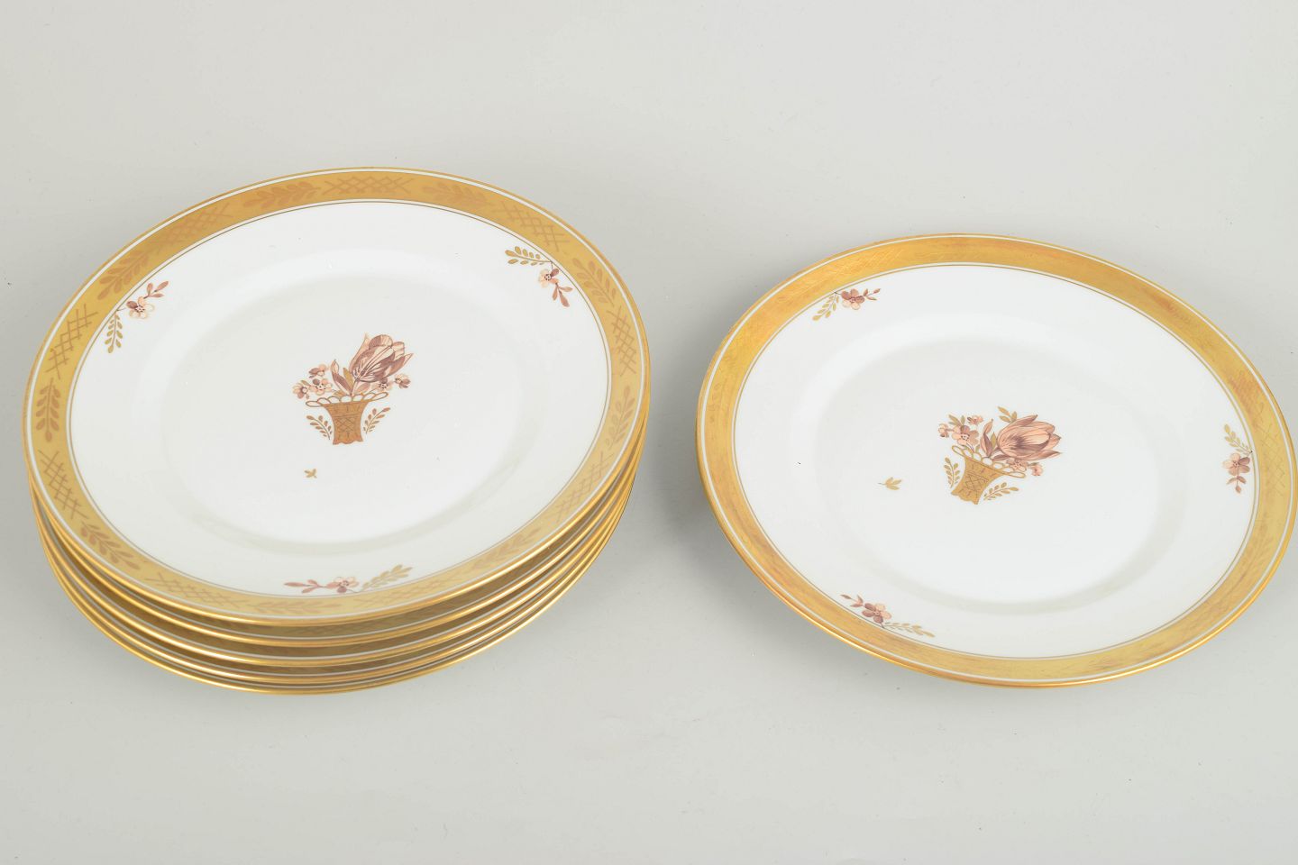 Sæt med seks frokosttallerkener i porcelæn fra Royal Copenhagens “Guldkurv”-serie. Klassisk hvid porcelæn med forgyldt kant og det karakteristiske håndmalede blomsterkurvmotiv.