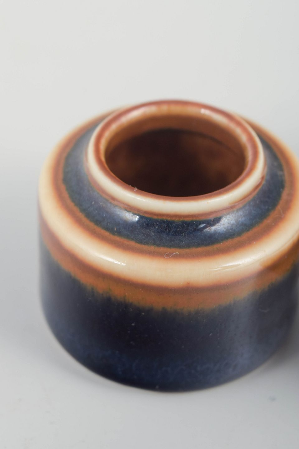 To små stentøjsobjekter i klassisk Stålhane-udtryk med dybe blåviolette glasurer, nuanceret af varme rosa og brune toner. Formsproget er enkelt og raffineret, typisk for Stålhane’s arbejde i 1950’erne og 60’erne.