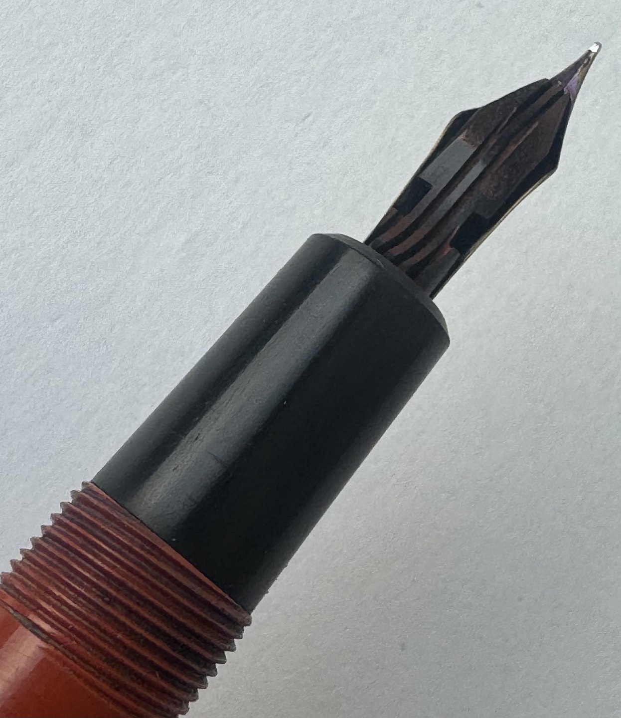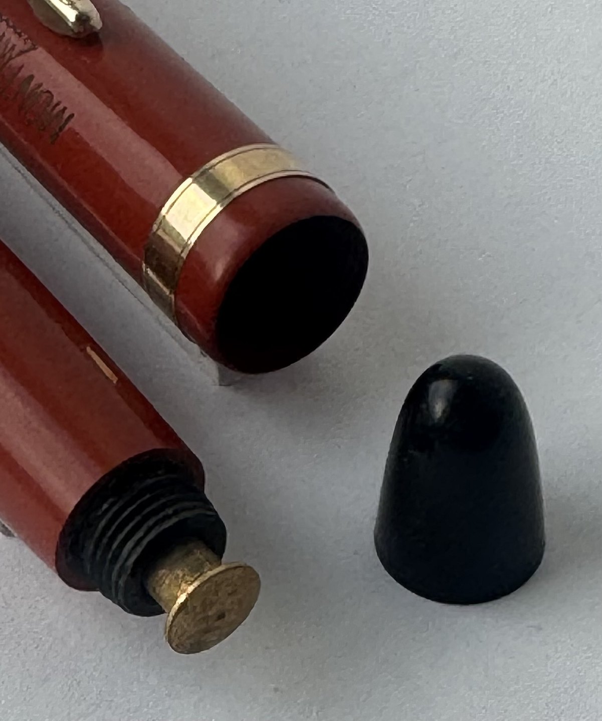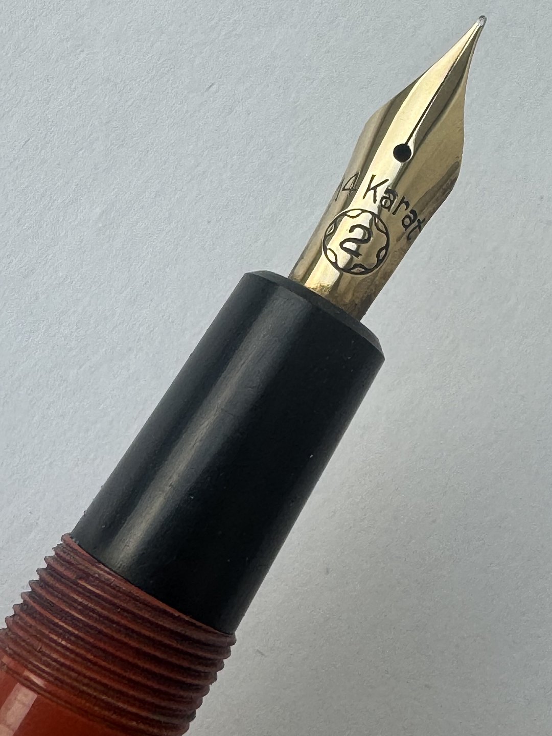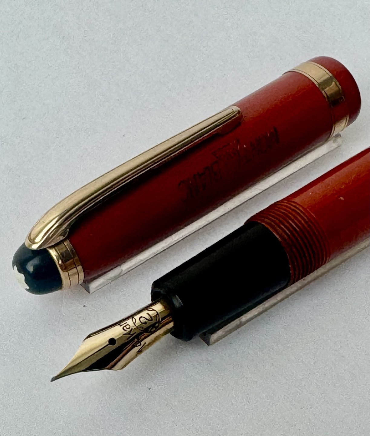 Koralrød Montblanc no. 212 fyldepen. Fremstår i god stand uden skader eller reparationer. Hætten mærket med MONTBLANC den lille sorte bundskrue med modelnummeret 212. Der skal indsættes en ny gummisæk, før end den igen kan optage blæk og skrive påny.