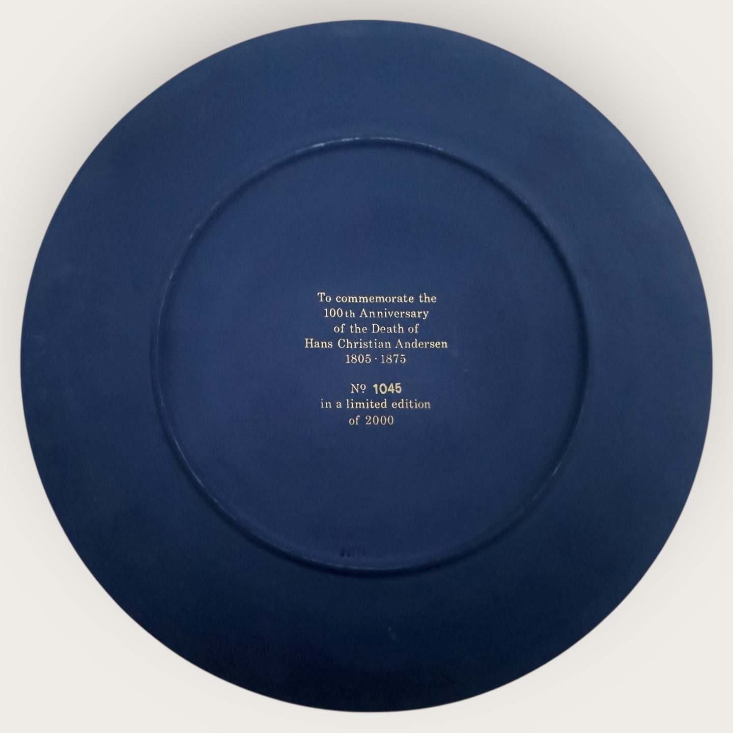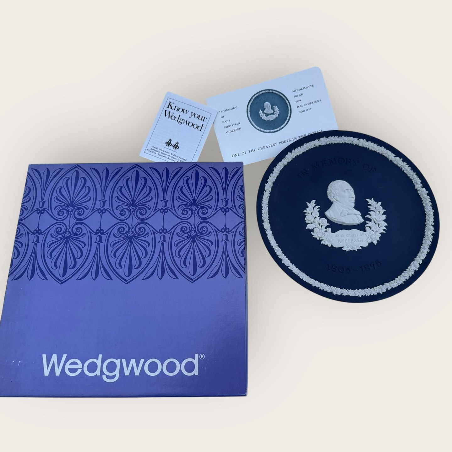 Wedgwood, H.C. Andersen, Mørkeblå Mindeplatte, " In memory of H.C. Andersen 1805-1875", platte no. 1045 af 2000 stk, Diameter 20,5cm, i original æske *perfekt stand*
